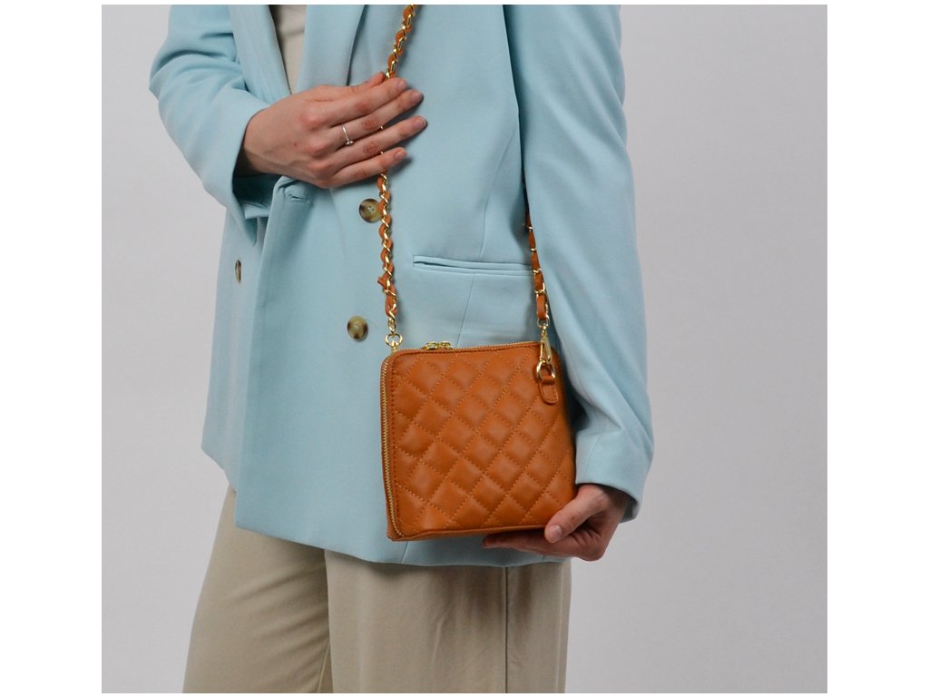 Elegantní, ale zároveň velmi praktická kabelka malých rozměrů vyrobena z pravé camel kůže. Díky pásku se zlatým řetízkem je nositelná přes rameno. Zip, kterým se uzavírá, vede po hraně kabelky až po spodní okraj na obou stranách, a proto je její vnitřek dobře dostupný. Na vnější zadní straně najdete na kabelce malou kapsu na zip a uvnitř dělí celý prostor na dvě části příčka, která současně slouží jako kapsa na zip. Hloubka jejího dna je 8 cm. Délka přídavného řetízku je cca 120 cm.