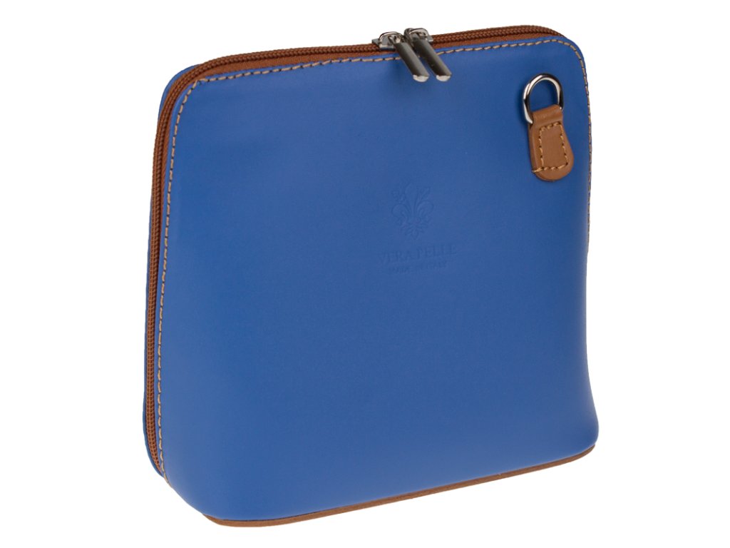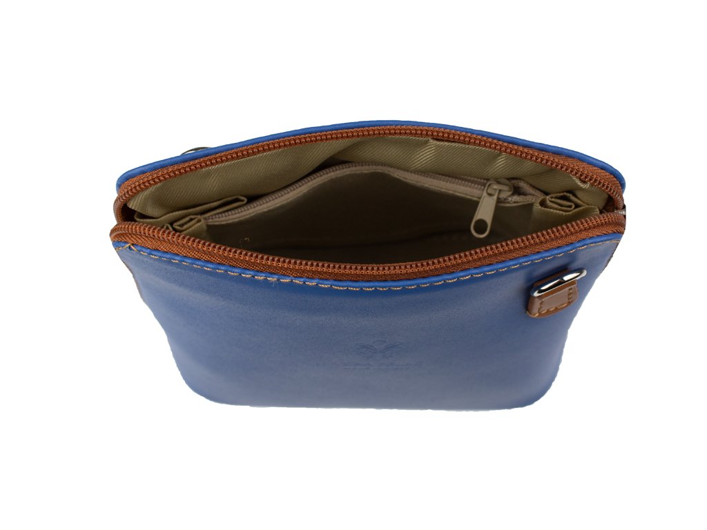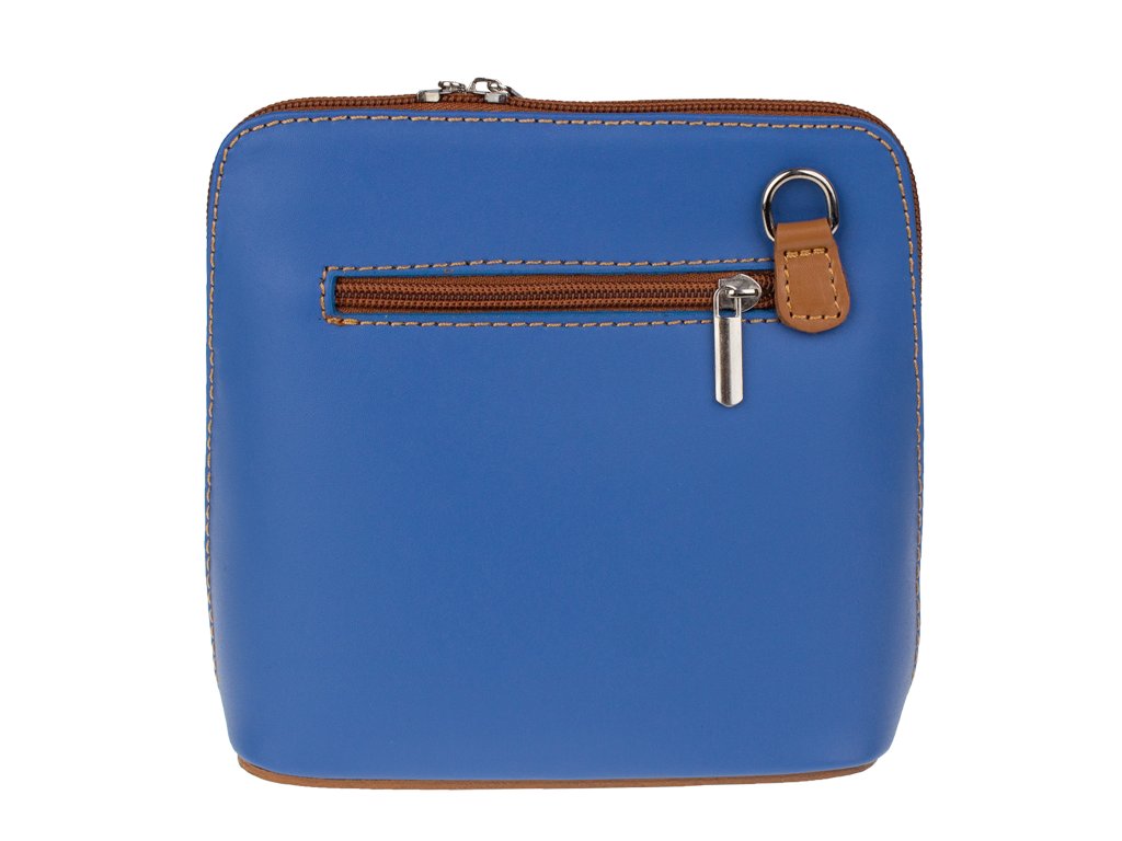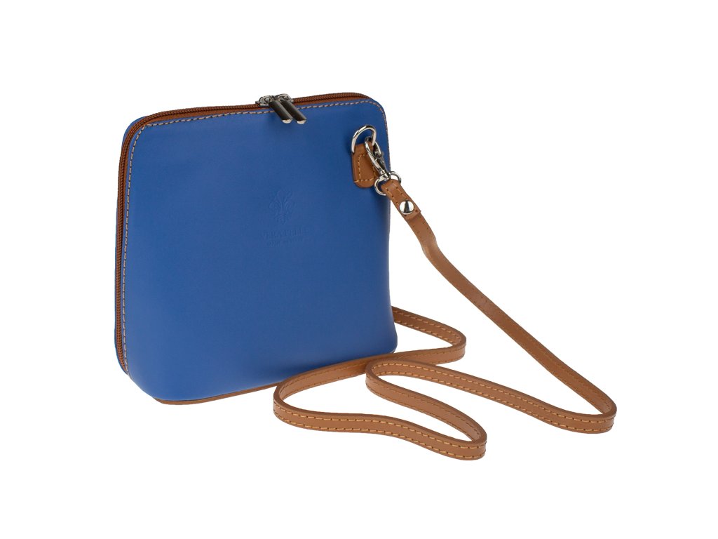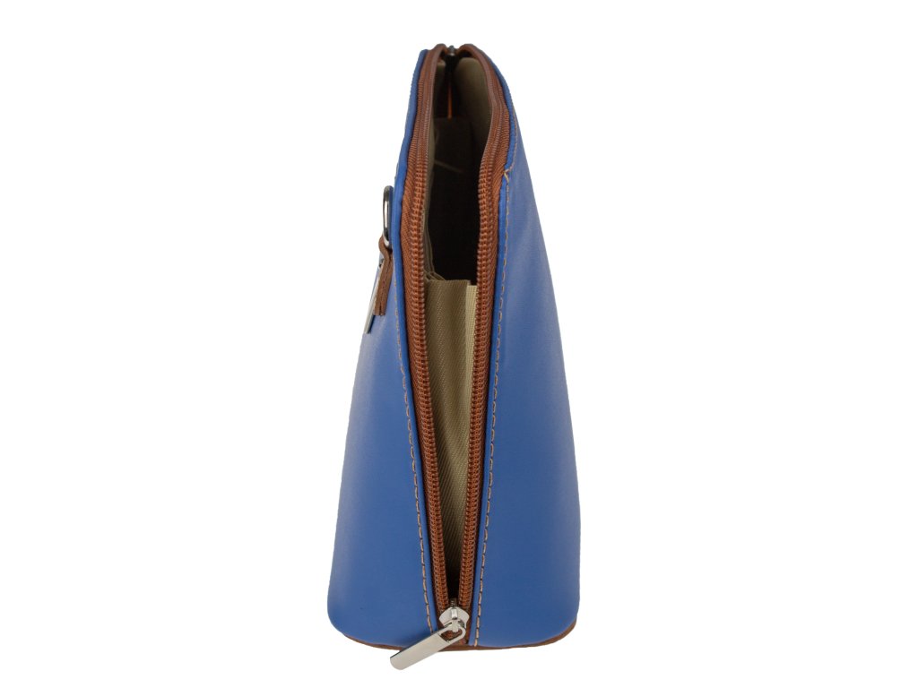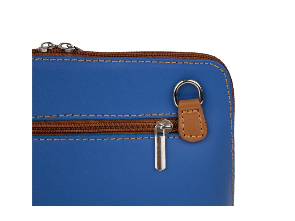 Elegantní, ale zároveň velmi praktická modrá kabelka malých rozměrů vyrobena z pravé kůže. Díky tenkému pásku je nositelná přes rameno. Zip, kterým se uzavírá, vede po hraně kabelky až po spodní okraj na obou stranách, a proto je její vnitřek dobře dostupný. Na vnější zadní straně najdete na kabelce malou kapsu na zip a uvnitř dělí celý prostor na dvě části příčka, která současně slouží jako kapsa na zip. Hloubka jejího dna je 8 cm. Délka přídavného popruhu je cca 120 cm.
