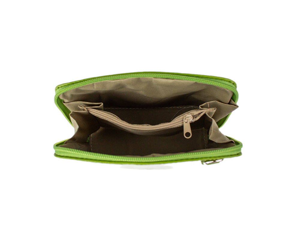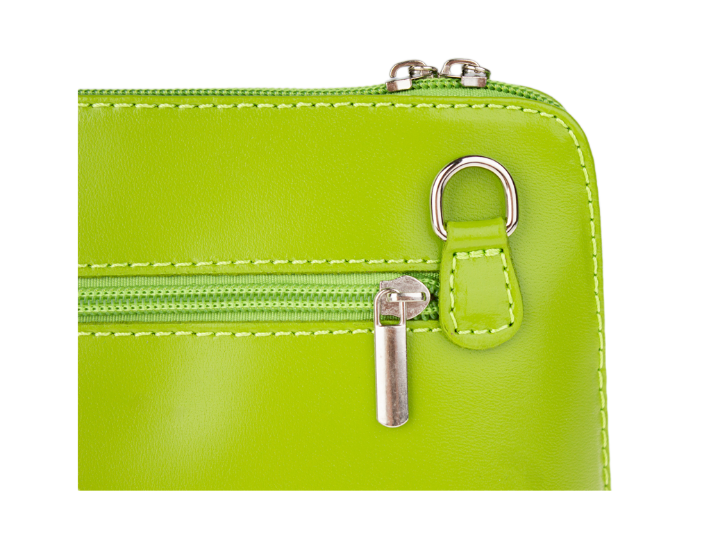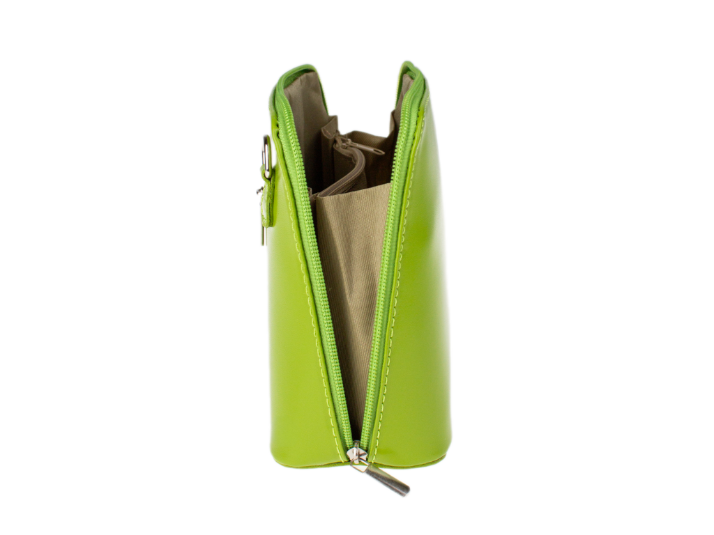 Elegantní, ale zároveň velmi praktická zelená kabelka malých rozměrů vyrobena z pravé kůže. Díky tenkému pásku je nositelná přes rameno. Zip, kterým se uzavírá, vede po hraně kabelky až po spodní okraj na obou stranách, a proto je její vnitřek dobře dostupný. Na vnější zadní straně najdete na kabelce malou kapsu na zip a uvnitř dělí celý prostor na dvě části příčka, která současně slouží jako kapsa na zip. Hloubka jejího dna je 8 cm. Délka přídavného popruhu je cca 120 cm.