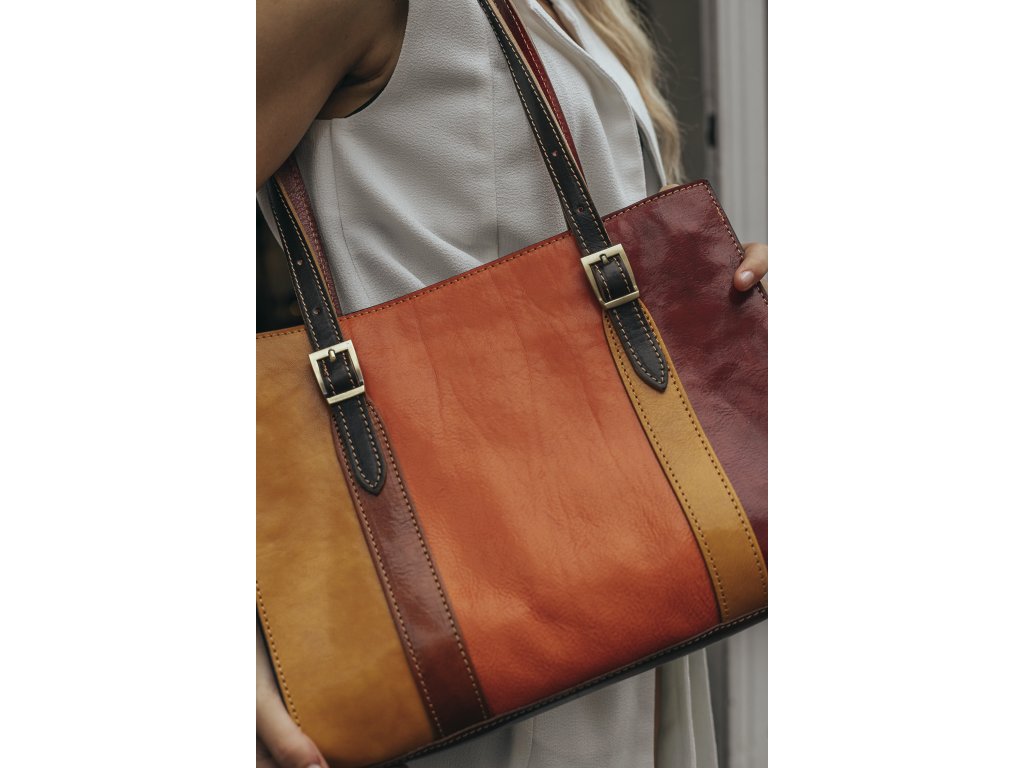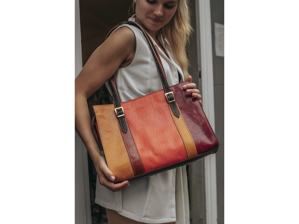 Klasická kožená kabelka ve vícebarevném provedení. Tato prostorná kabelka je uvnitř rozdělena přepážkou uzavíratelnou na zip. Kabelka je vhodná pro nošení přes rameno nebo v ruce.