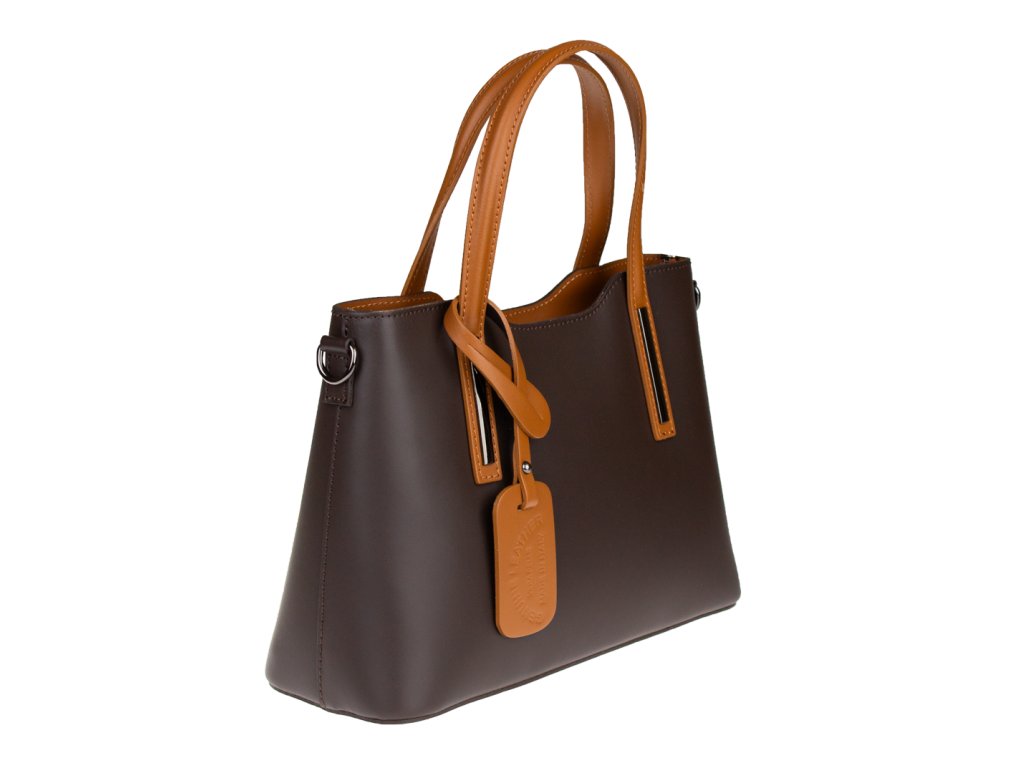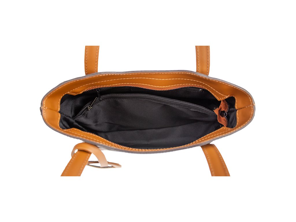 Praktická kabelka v cafe provedení pro každodenní nošení vyrobená z pevné pravé kůže. Nosí se v ruce nebo na rameni. Kabelka je uzavíratelná na zip. Součástí balení je přídavný popruh - cca 107 cm v plné délce. Uvnitř kabelky najdeme přepážku uprostřed, která zároveň slouží jako kapsa na zip, a na bočních stěnách pak kapsu na zip a 2 malé kapsy vhodné např. pro mobil a peněženku.