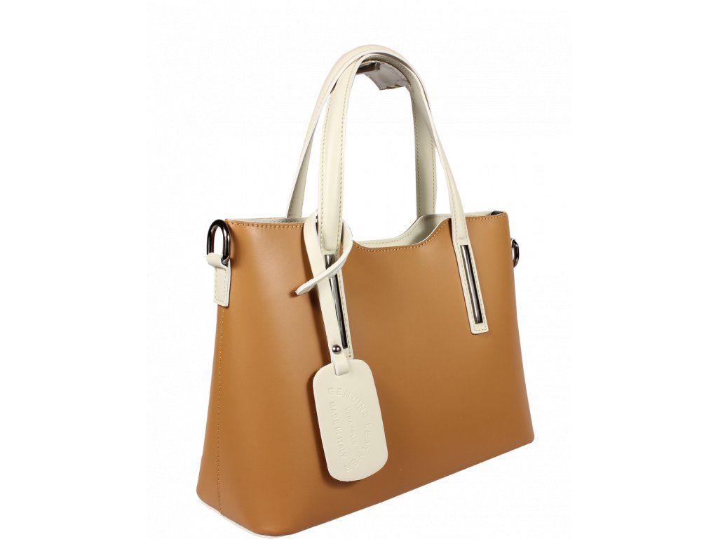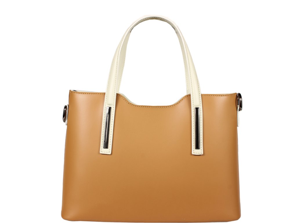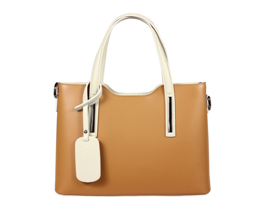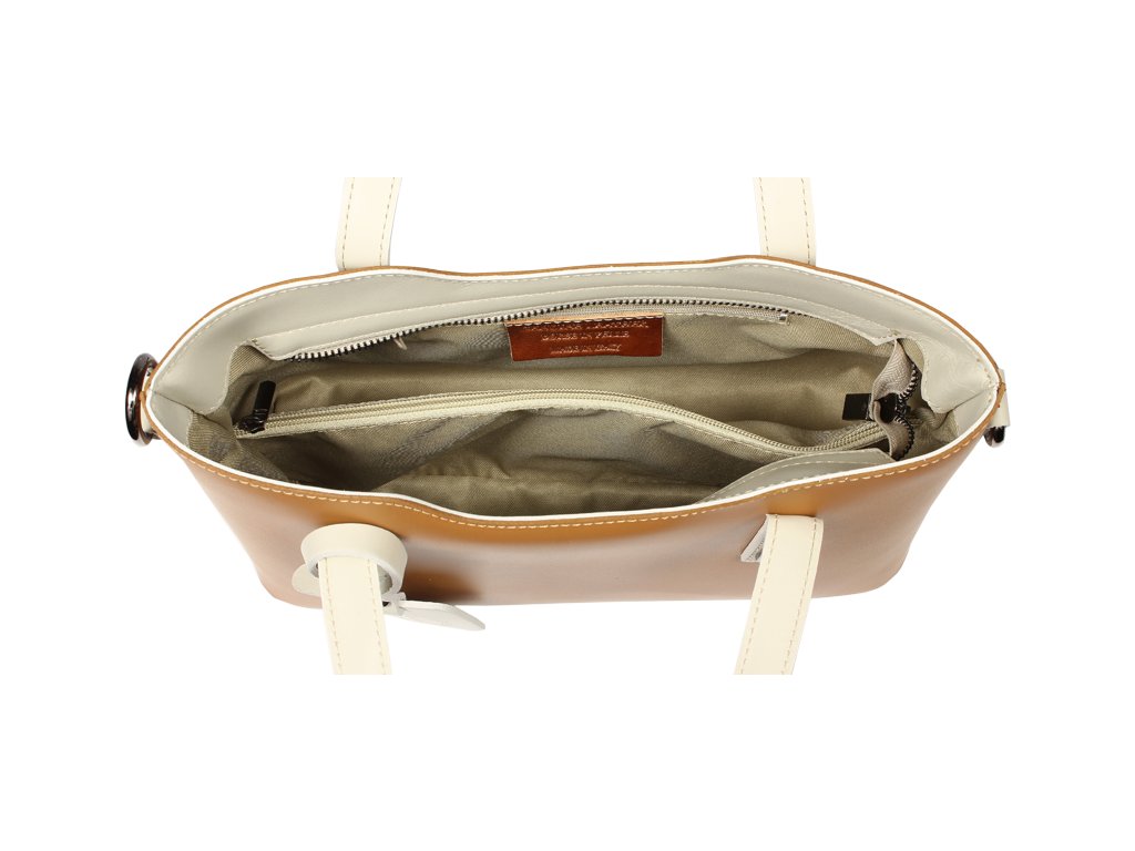 Praktická kabelka v camel provedení pro každodenní nošení vyrobená z pevné pravé kůže. Nosí se v ruce nebo na rameni. Kabelka je uzavíratelná na zip. Součástí balení je přídavný nastavitelný popruh - cca 107 cm v plné délce. Uvnitř kabelky najdeme přepážku uprostřed, která zároveň slouží jako kapsa na zip, a na bočních stěnách pak kapsu na zip a 2 malé kapsy vhodné např. pro mobil a peněženku.