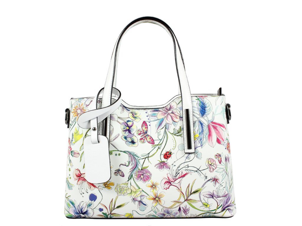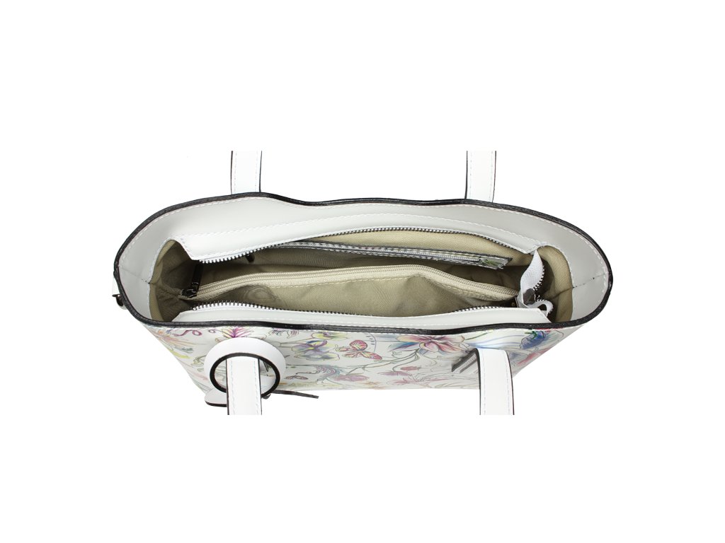 Praktická kabelka v květovaném provedení pro každodenní nošení vyrobená z pevné pravé kůže. Nosí se v ruce nebo na rameni. Kabelka je uzavíratelná na zip. Součástí balení je přídavný nastavitelný popruh - cca 107 cm v plné délce. Uvnitř kabelky najdeme přepážku uprostřed, která zároveň slouží jako kapsa na zip, a na bočních stěnách pak kapsu na zip a 2 malé kapsy vhodné např. pro mobil a peněženku.