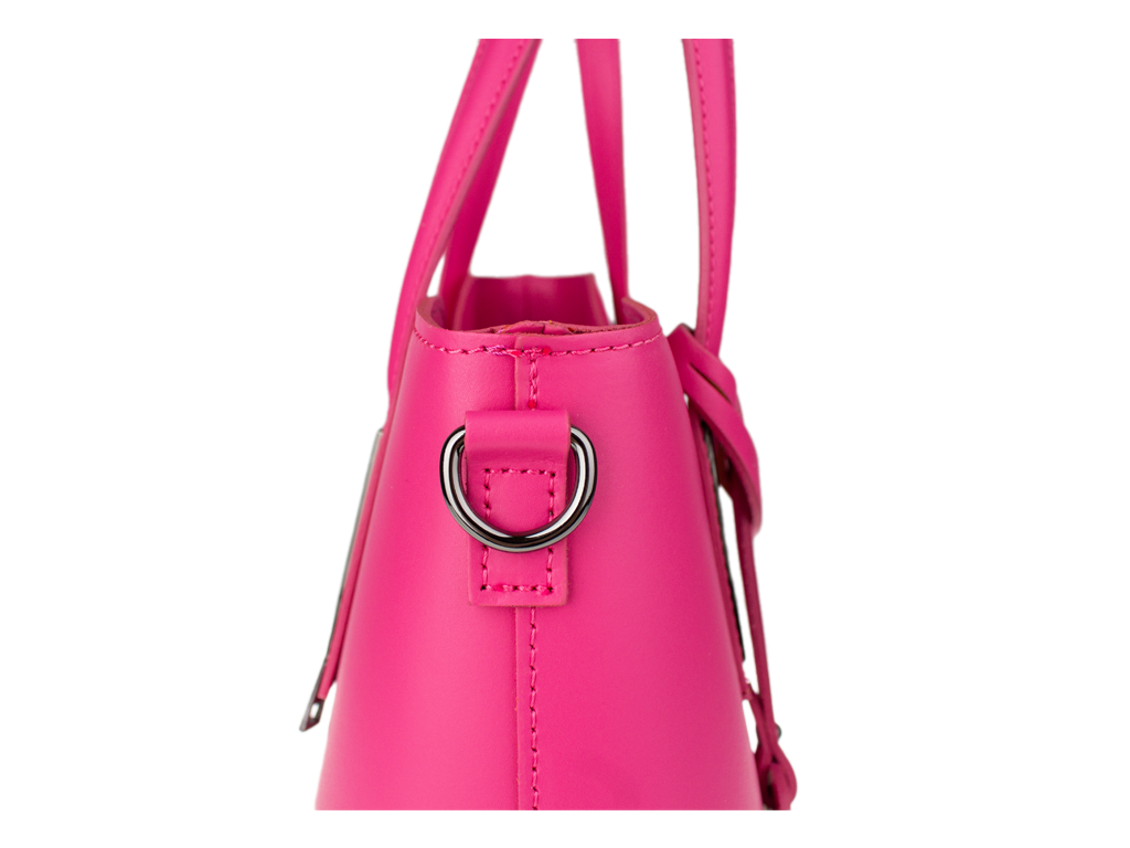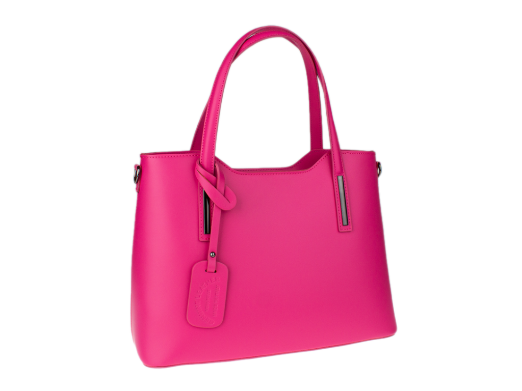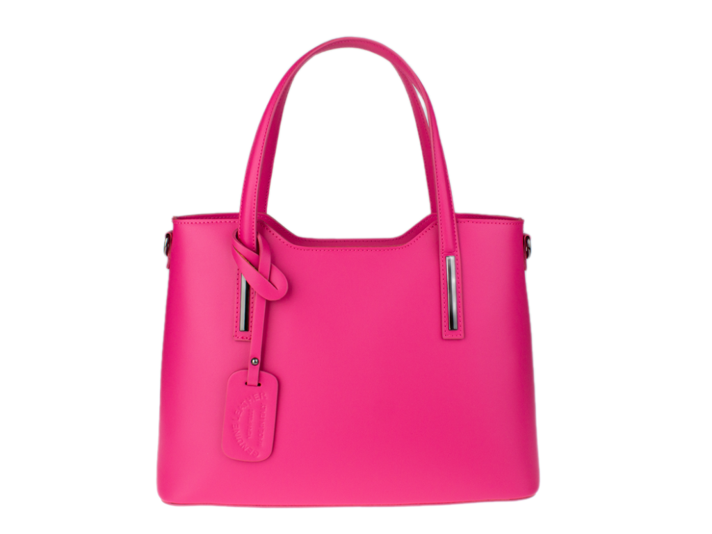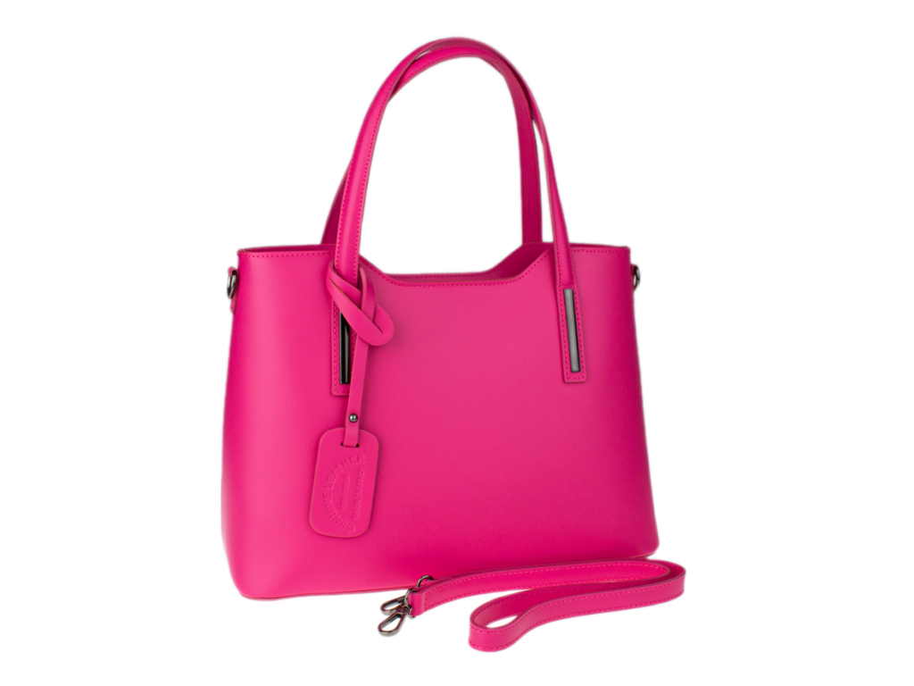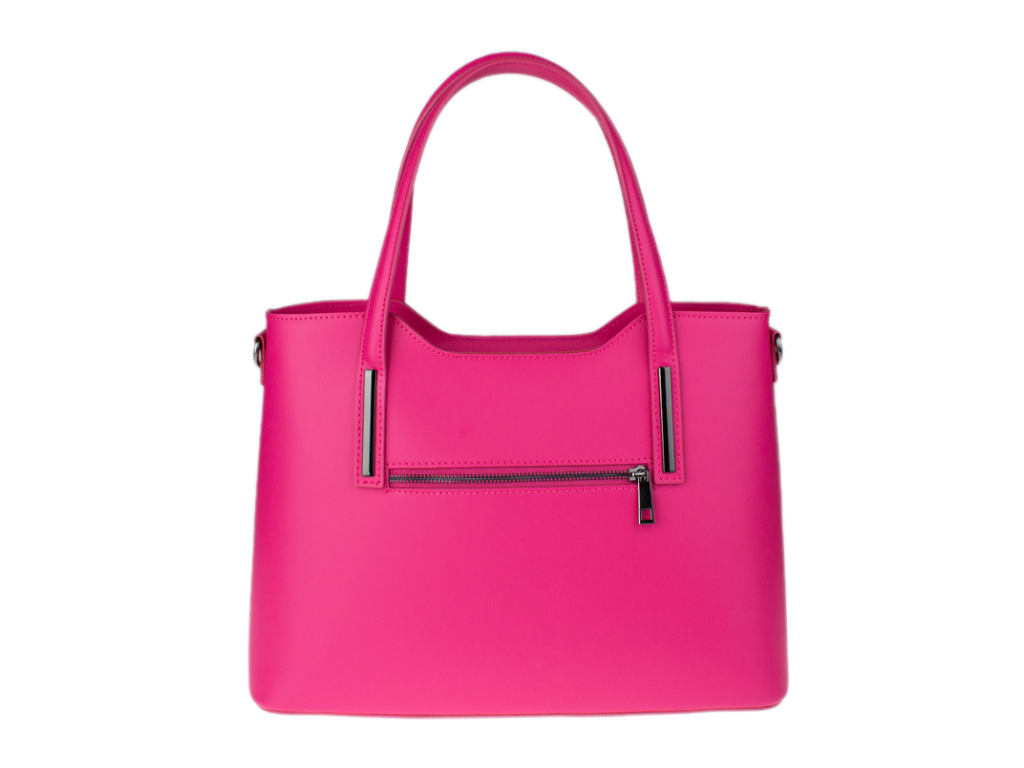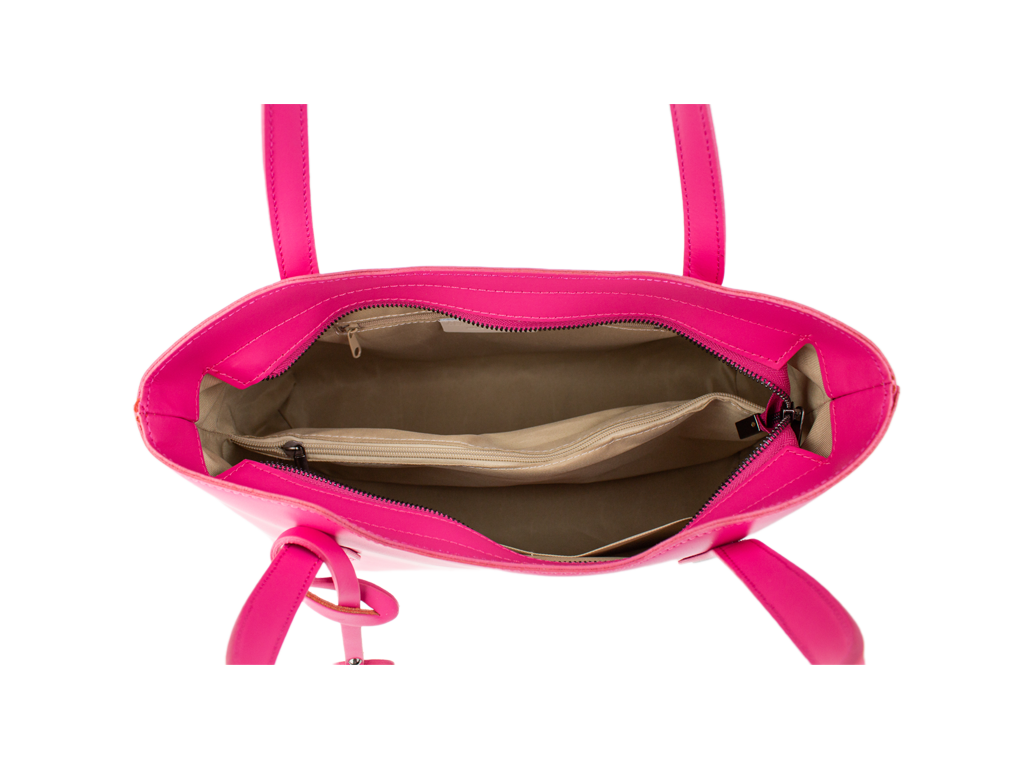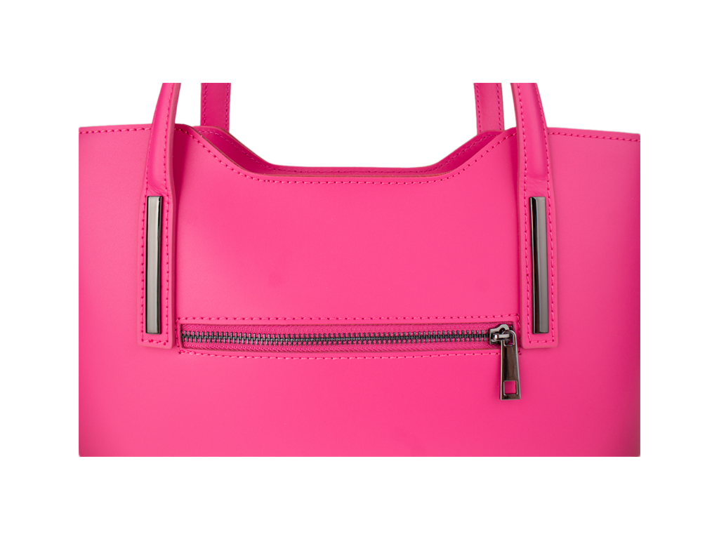 Praktická kabelka v růžovém provedení pro každodenní nošení vyrobená z pevné pravé kůže. Nosí se v ruce nebo na rameni. Kabelka je uzavíratelná na zip. Součástí balení je přídavný popruh - cca 107 cm v plné délce. Uvnitř kabelky najdeme přepážku uprostřed, která zároveň slouží jako kapsa na zip, a na bočních stěnách pak kapsu na zip a 2 malé kapsy vhodné např. pro mobil a peněženku.