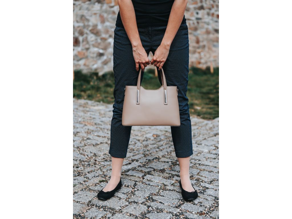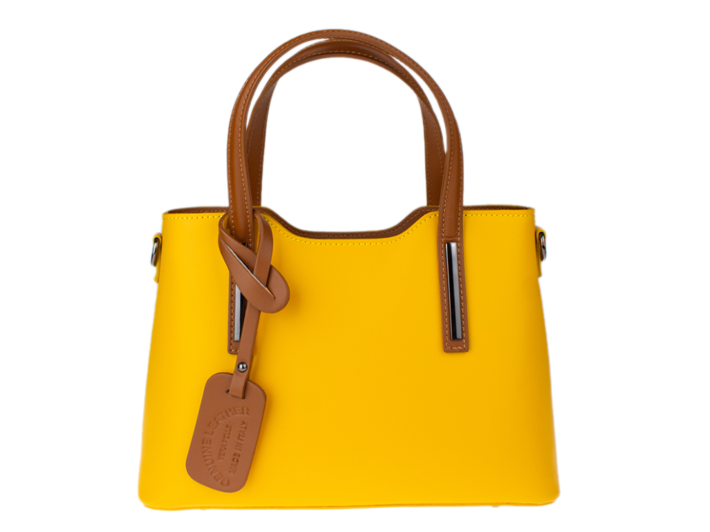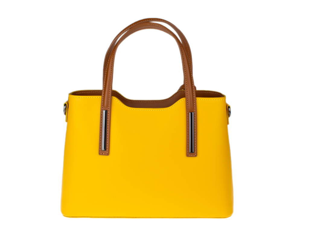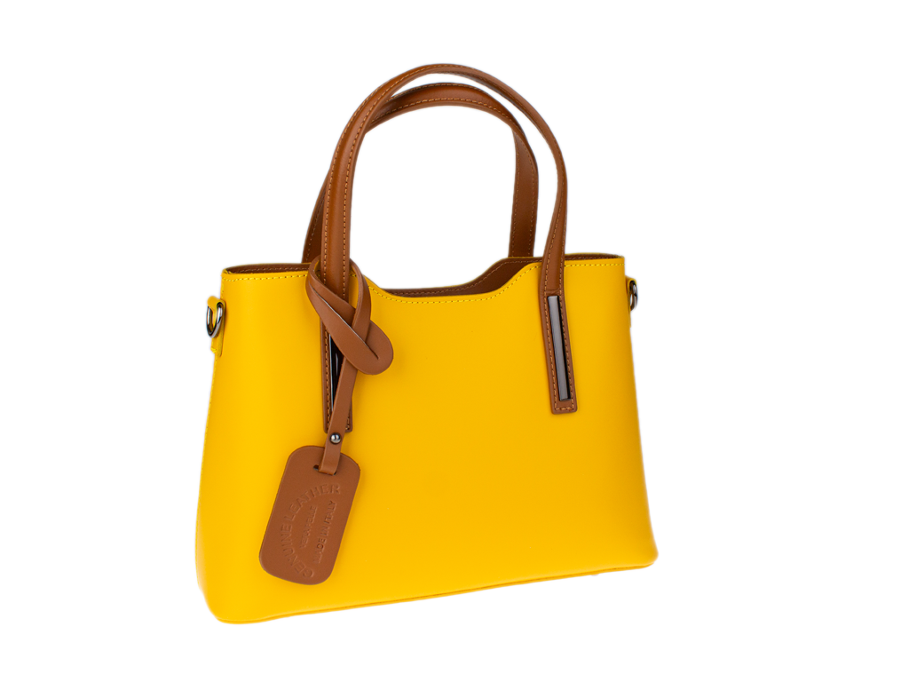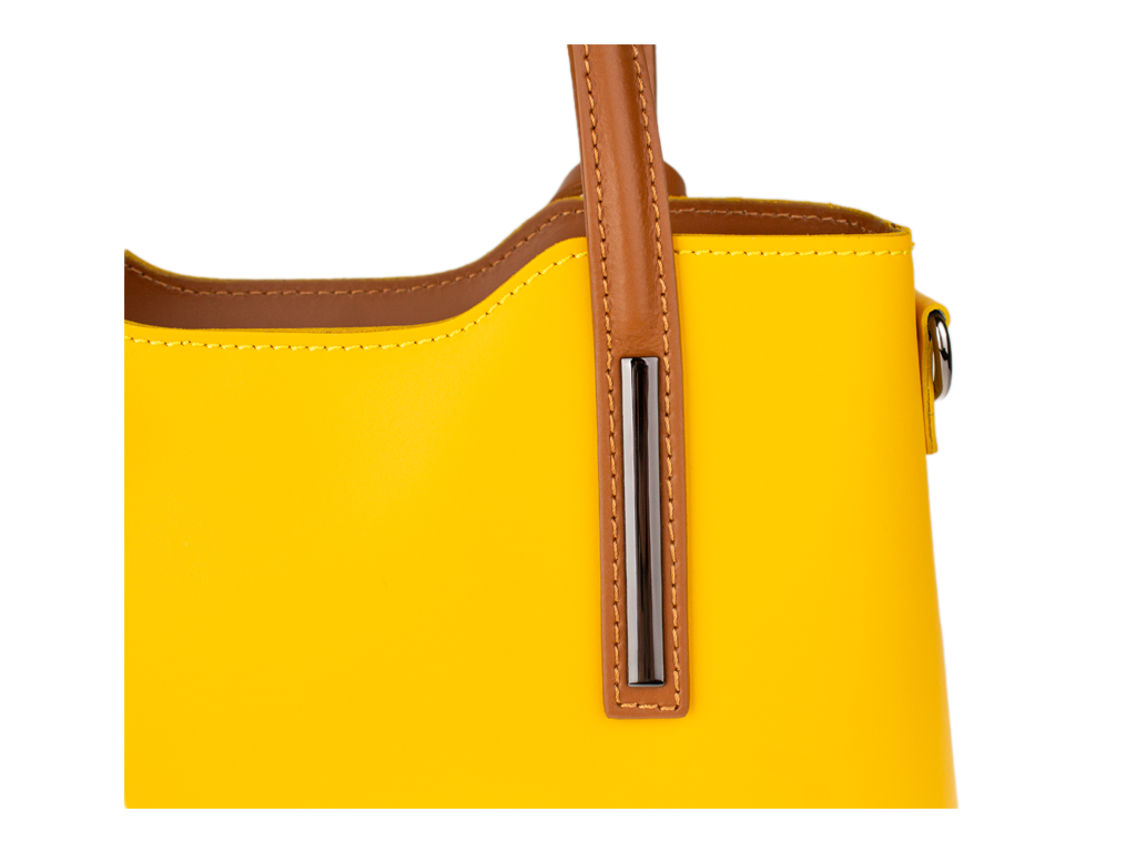 Praktická kabelka ve žlutém provedení pro každodenní nošení vyrobená z pevné pravé kůže. Nosí se v ruce nebo na rameni. Kabelka je uzavíratelná na zip. Součástí balení je přídavný popruh - cca 107 cm v plné délce. Uvnitř kabelky najdeme přepážku uprostřed, která zároveň slouží jako kapsa na zip, a na bočních stěnách pak kapsu na zip a 2 malé kapsy vhodné např. pro mobil a peněženku.