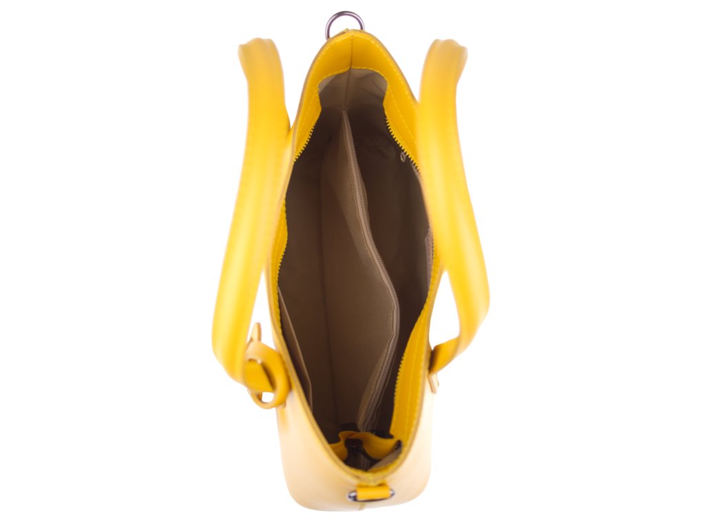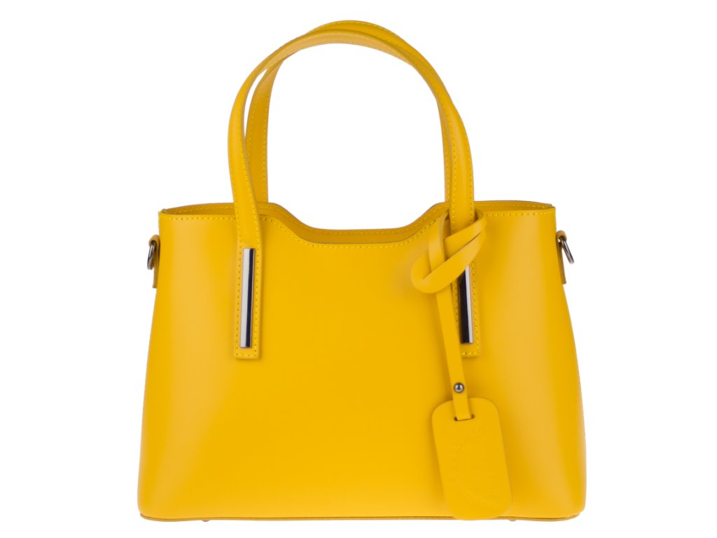 Praktická kabelka ve žlutém provedení pro každodenní nošení vyrobená z pevné pravé kůže. Nosí se v ruce nebo na rameni. Kabelka je uzavíratelná na zip. Součástí balení je přídavný nastavitelný popruh - cca 107 cm v plné délce. Uvnitř kabelky najdeme přepážku uprostřed, která zároveň slouží jako kapsa na zip, a na bočních stěnách pak kapsu na zip a 2 malé kapsy vhodné např. pro mobil a peněženku.