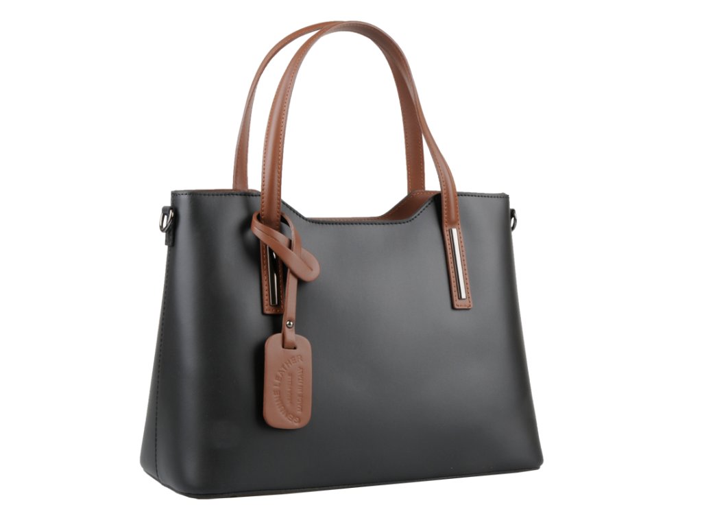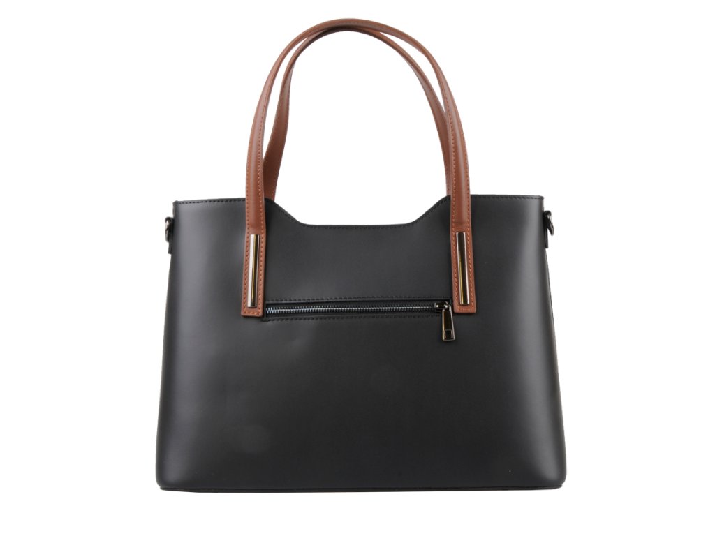 Praktická kabelka v černém provedení pro každodenní nošení vyrobená z pevné pravé kůže. Nosí se v ruce nebo na rameni. Kabelka je uzavíratelná na zip. Součástí balení je přídavný popruh - cca 107 cm v plné délce. Uvnitř kabelky najdeme přepážku uprostřed, která zároveň slouží jako kapsa na zip, a na bočních stěnách pak kapsu na zip a 2 malé kapsy vhodné např. pro mobil a peněženku.