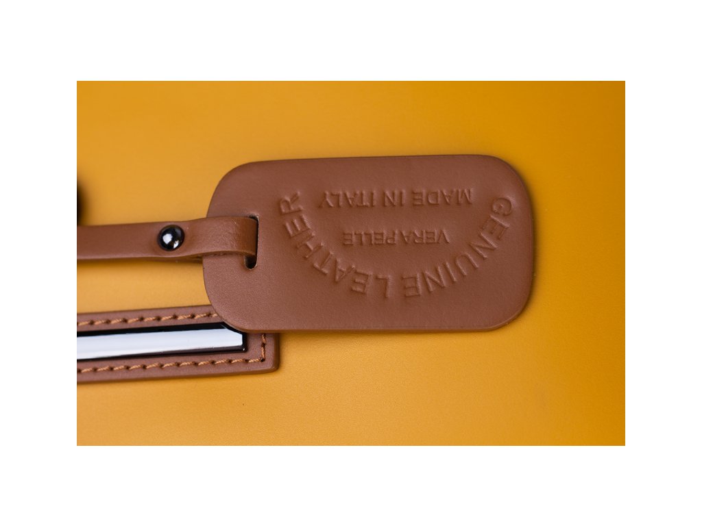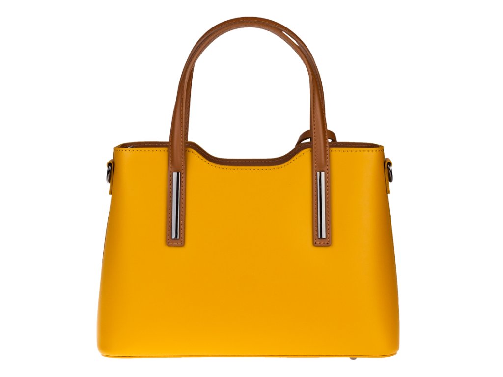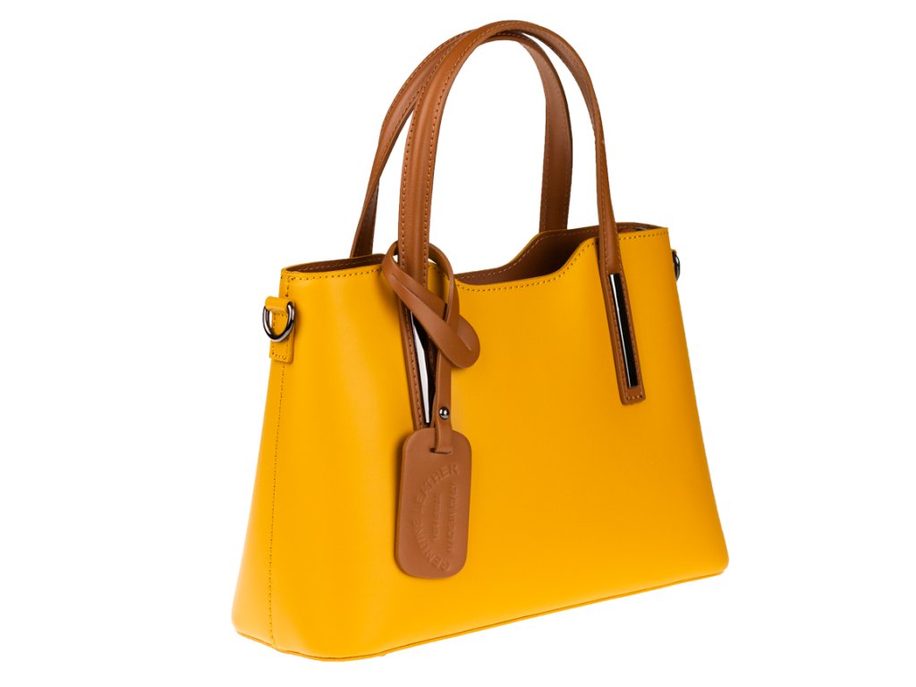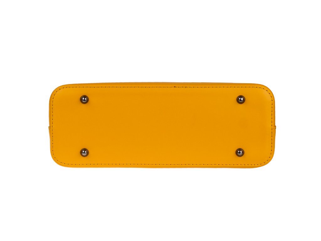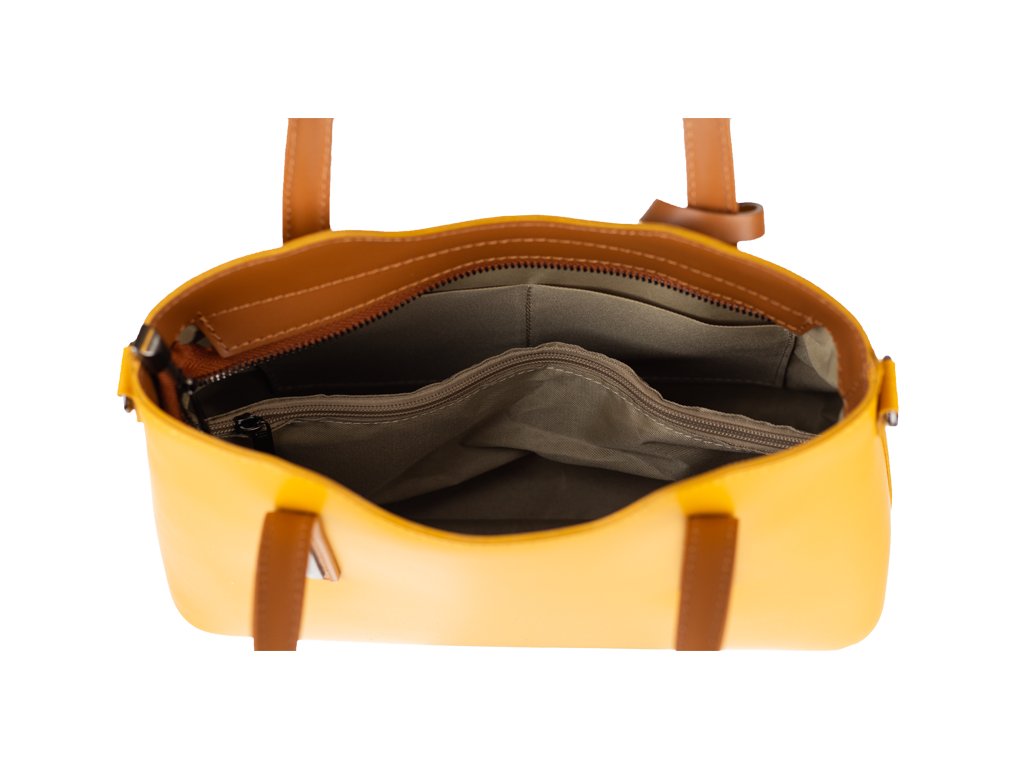 Praktická kabelka ve žlutém provedení pro každodenní nošení vyrobená z pevné pravé kůže. Nosí se v ruce nebo na rameni. Kabelka je uzavíratelná na zip. Součástí balení je přídavný popruh - cca 107 cm v plné délce. Uvnitř kabelky najdeme přepážku uprostřed, která zároveň slouží jako kapsa na zip, a na bočních stěnách pak kapsu na zip a 2 malé kapsy vhodné např. pro mobil a peněženku.