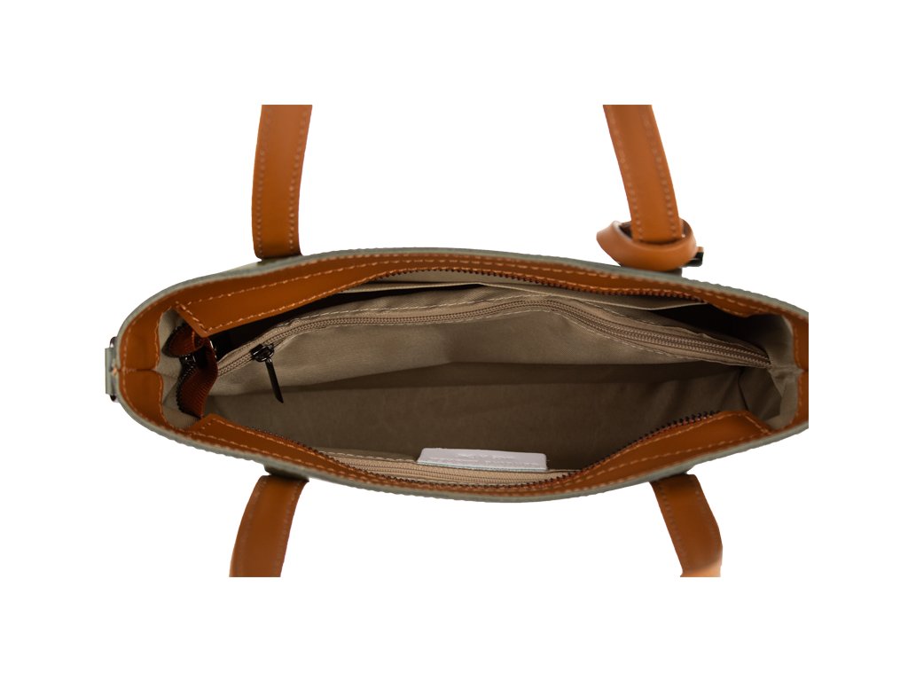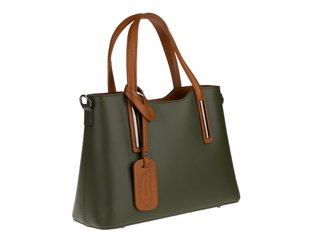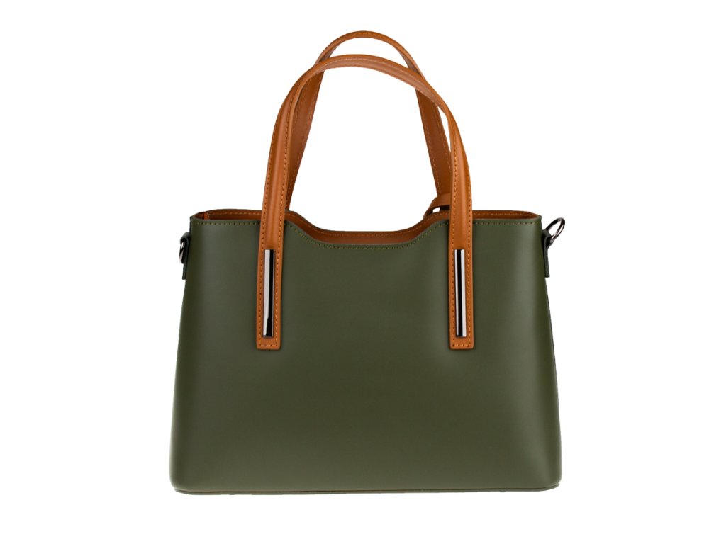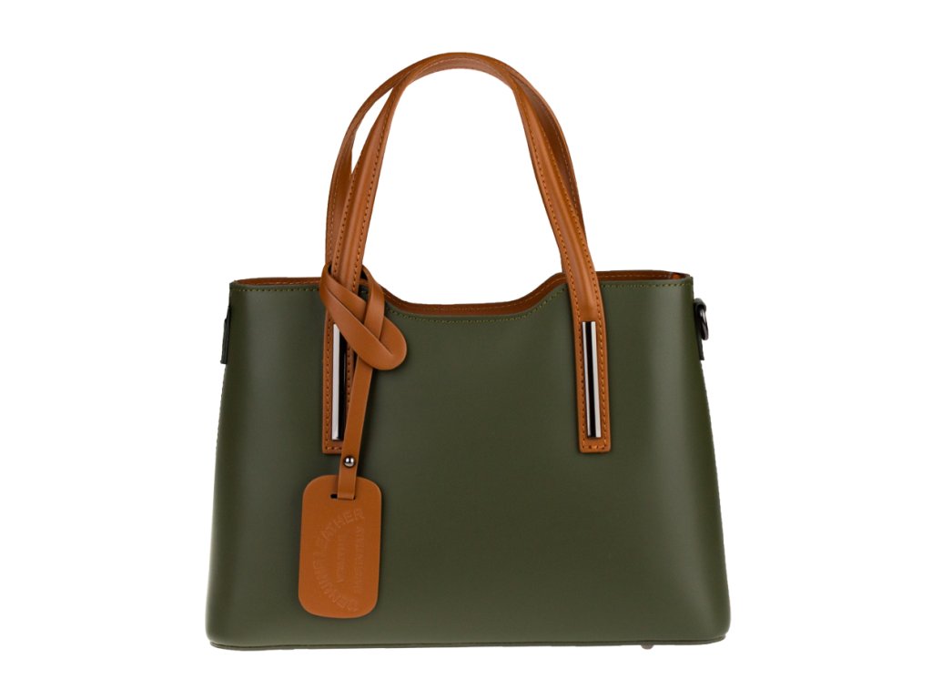 Praktická kabelka v zeleném provedení pro každodenní nošení vyrobená z pevné pravé kůže. Nosí se v ruce nebo na rameni. Kabelka je uzavíratelná na zip. Součástí balení je přídavný popruh - cca 107 cm v plné délce. Uvnitř kabelky najdeme přepážku uprostřed, která zároveň slouží jako kapsa na zip, a na bočních stěnách pak kapsu na zip a 2 malé kapsy vhodné např. pro mobil a peněženku.