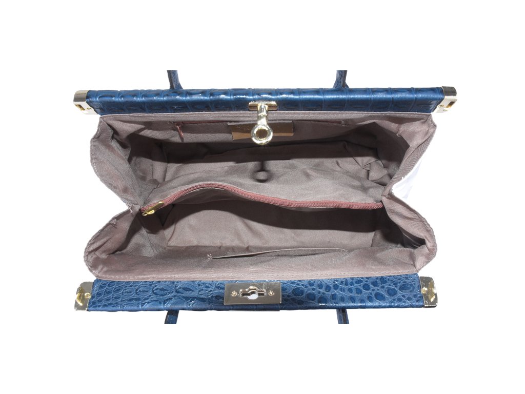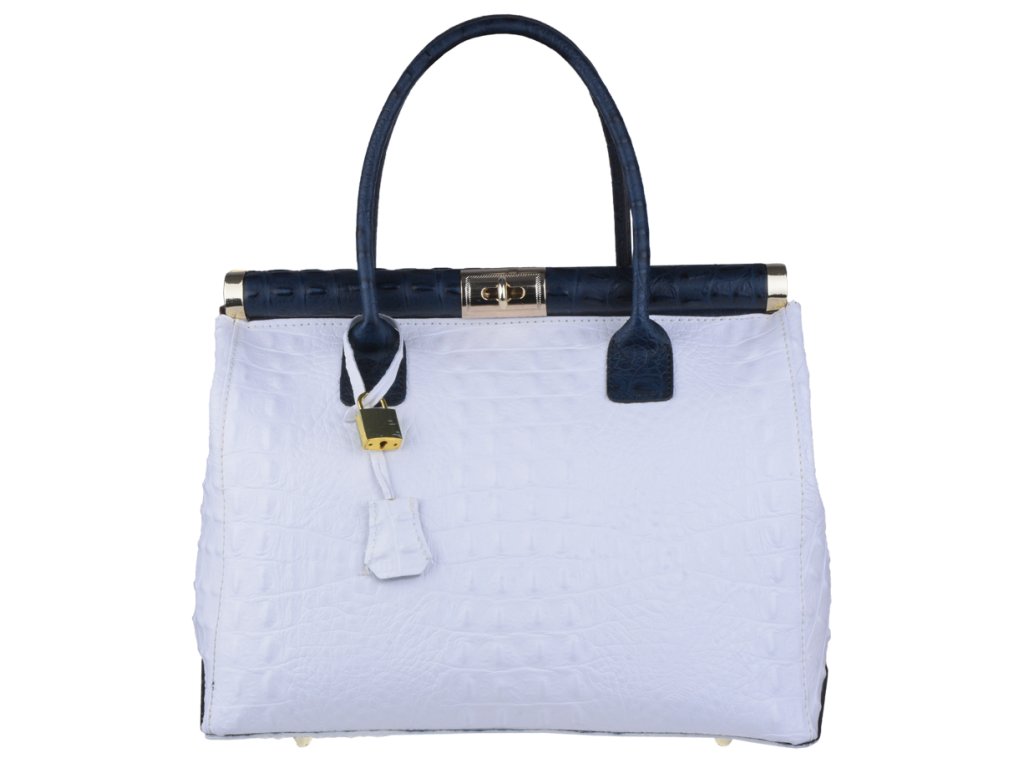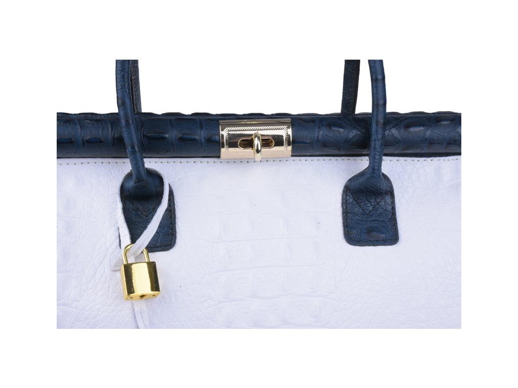 Tato kabelka zvaná též "doktorská" se může pochlubit kromě svého klasického designu tím, že dobře drží tvar. Bílo modrá kožená kabelka je nositelná do ruky a uzavíratelná na patentek, který pak v případě potřeby můžete uzamknout přiloženým zámečkem. Jejím materiálem je pravá kůže s úpravou krokodýlí textury. Součástí balení je přídavný bílí vdélce cca 100 cm. Uvnitř najdete kapsu na zip a 2 malé kapsy vhodné např. pro Váš mobil a peněženku a uprostřed je látková přepážka také s kapsou na zip. Kabelka má navíc k tomu všemu kapsu na zip na vnější zadní straně. Hloubka jejího dna je 15 cm.