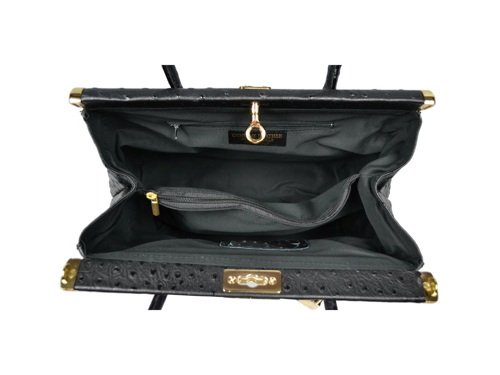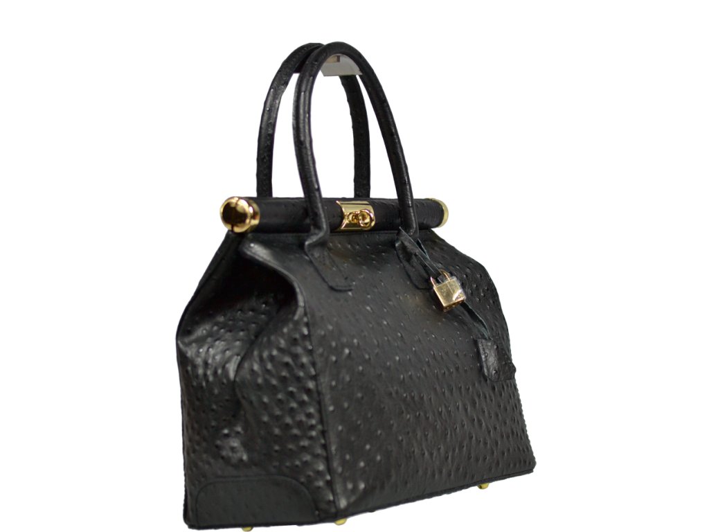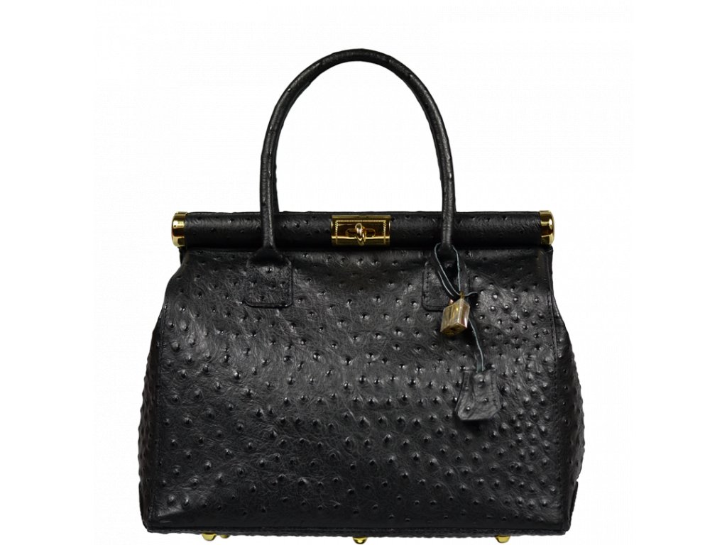 Tato kabelka zvaná též "doktorská" se může pochlubit kromě svého klasického designu tím, že dobře drží tvar. Tato černá kožená kabelka je nositelná do ruky a uzavíratelná na patentek, který pak v případě potřeby můžete uzamknout přiloženým zámečkem. Jejím materiálem je pravá kůže s úpravou pštrosí textury. Součástí balení je přídavný pásek v délce cca 97 cm. Uvnitř najdete kapsu na zip a 2 malé kapsy vhodné např. pro Váš mobil a peněženku a uprostřed je látková přepážka také s kapsou na zip. Kabelka má navíc k tomu všemu kapsu na zip na vnější zadní straně. Hloubka jejího dna je 15 cm.