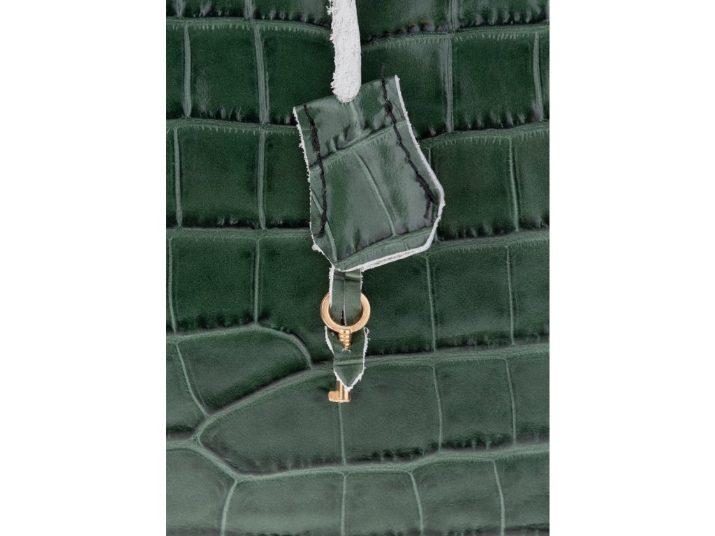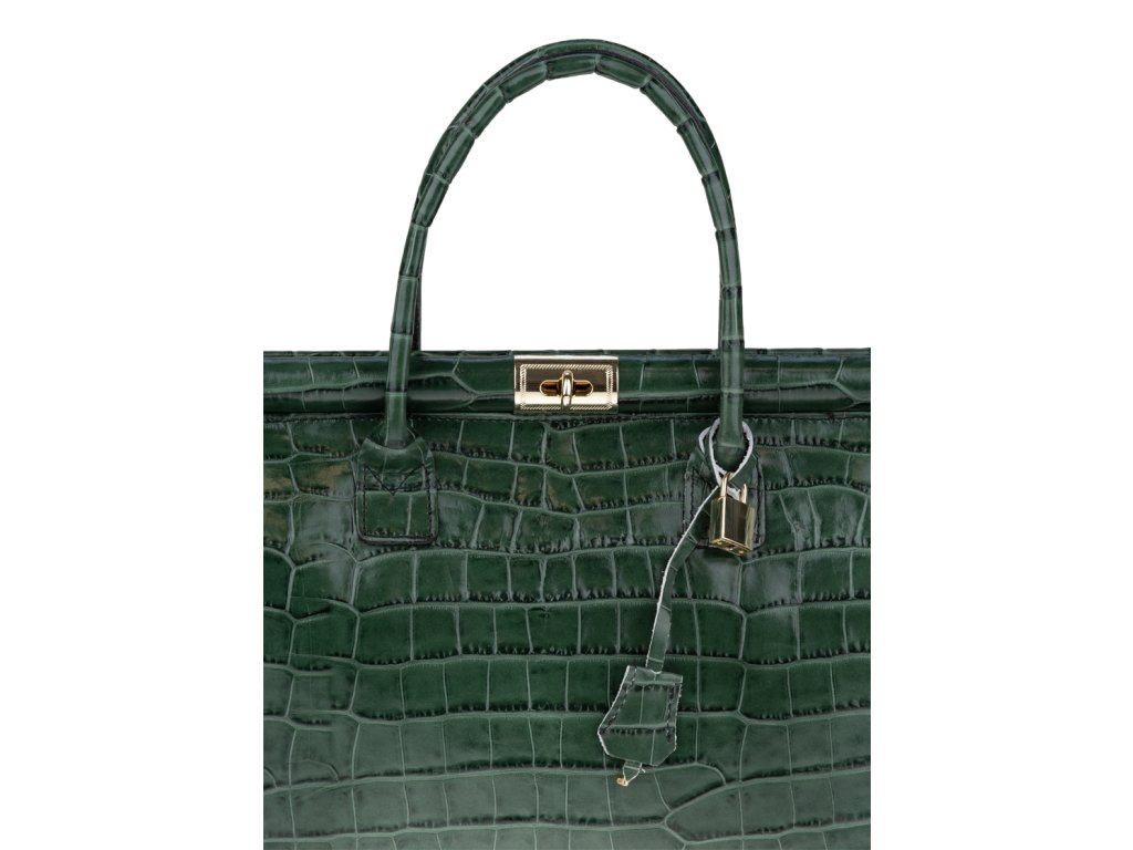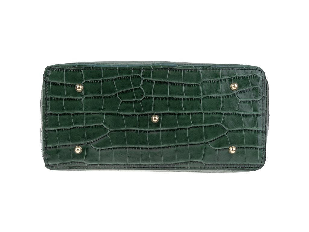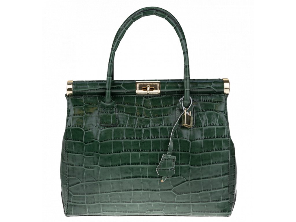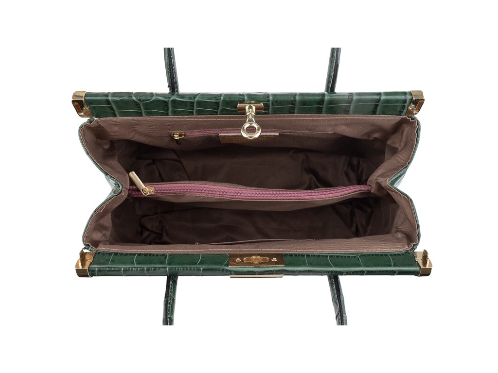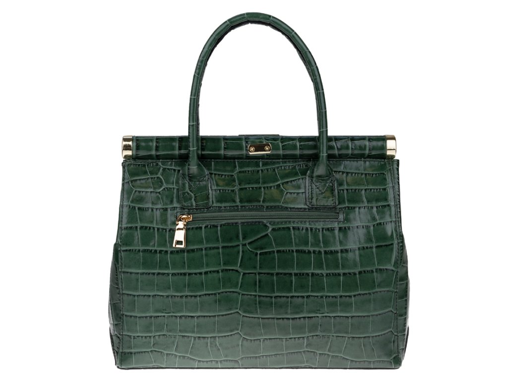 Tato zelená kabelka zvaná též "doktorská" se může pochlubit kromě svého klasického designu tím, že dobře drží tvar. Zelená kožená kabelka je nositelná do ruky a uzavíratelná na patentek, který pak v případě potřeby můžete uzamknout přiloženým zámečkem. Jejím materiálem je pravá kůže v zelené barvě. Uvnitř najdete kapsu na zip a 2 malé kapsy vhodné např. pro Váš mobil a peněženku a uprostřed je látková přepážka také s kapsou na zip. Kabelka má navíc k tomu všemu kapsu na zip na vnější zadní straně. Hloubka jejího dna je 15 cm.