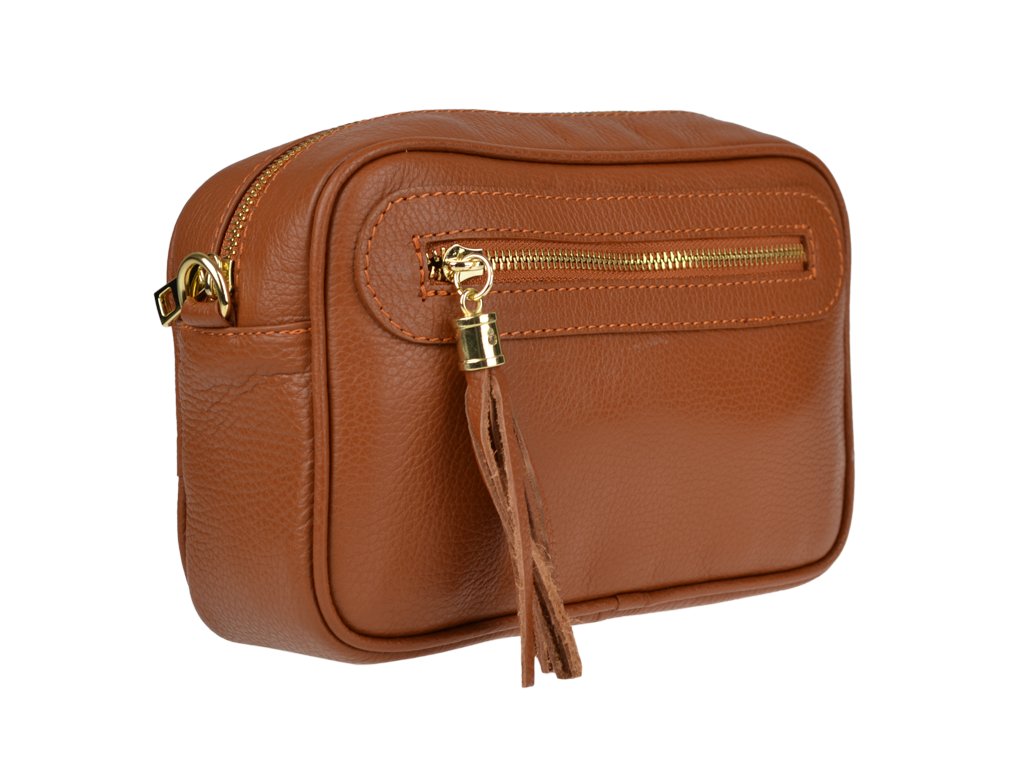 Malá praktická kožená kabelka, kterou lze nosit přes rameno nebo cross-body (křížem). Kabelka se uzavírá pomocí zipu a uvnitř najdeme přihrádku pro vše potřebné.