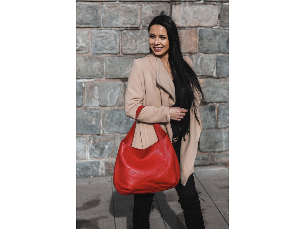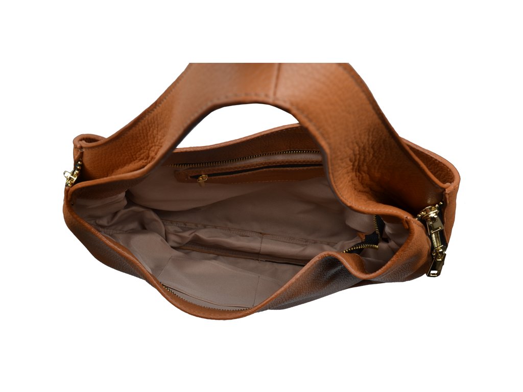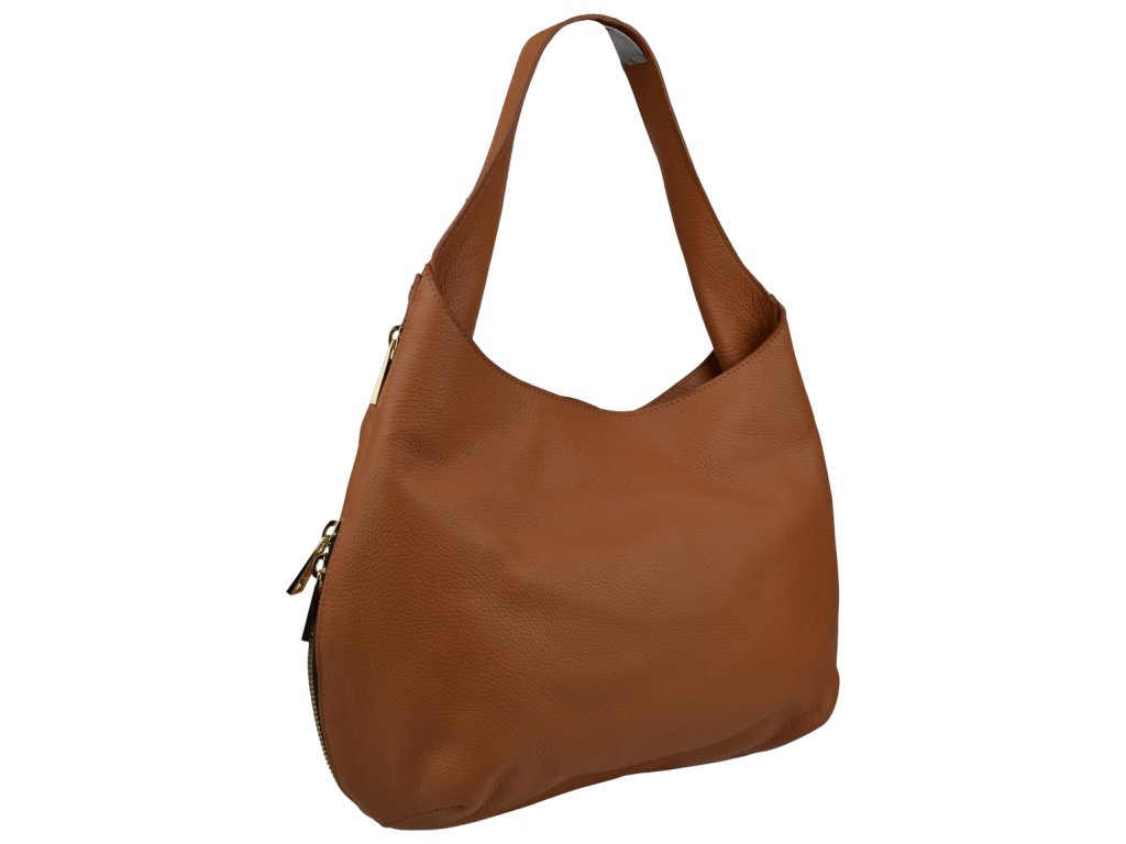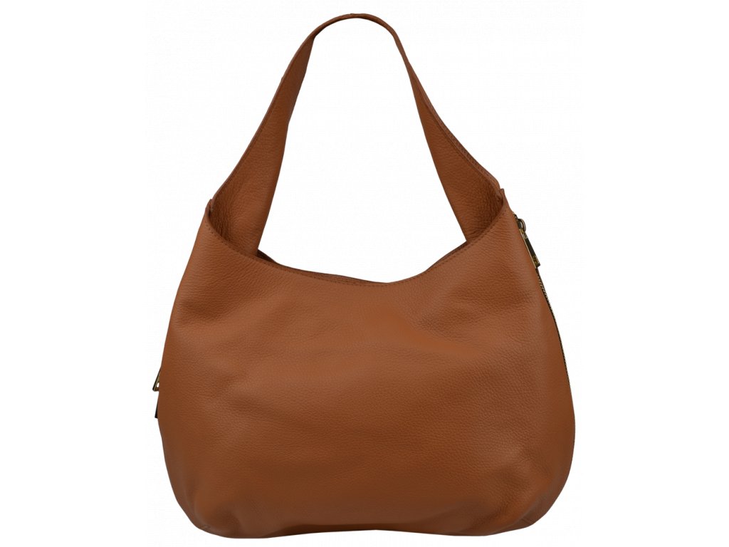 Moderní oblíbená kabelka v camel barvě. Tato kožená kabelka je uzavíratelná pomocí zipu. Její materiálem je pravá kůže. Kabelku lze nosit přes rameno nebo v ruce. Uvnitř kabelky najdeme na bočních stěnách kapsu na zip a na druhé straně další malou kapsu. Pohodlně se do ní vejdou dokumenty formátu A4. Ozdobný zip (ve zlaté barvě) na bocích kabelky slouží i jako rozšíření hloubky kabelky z 6 cm na 11 cm.