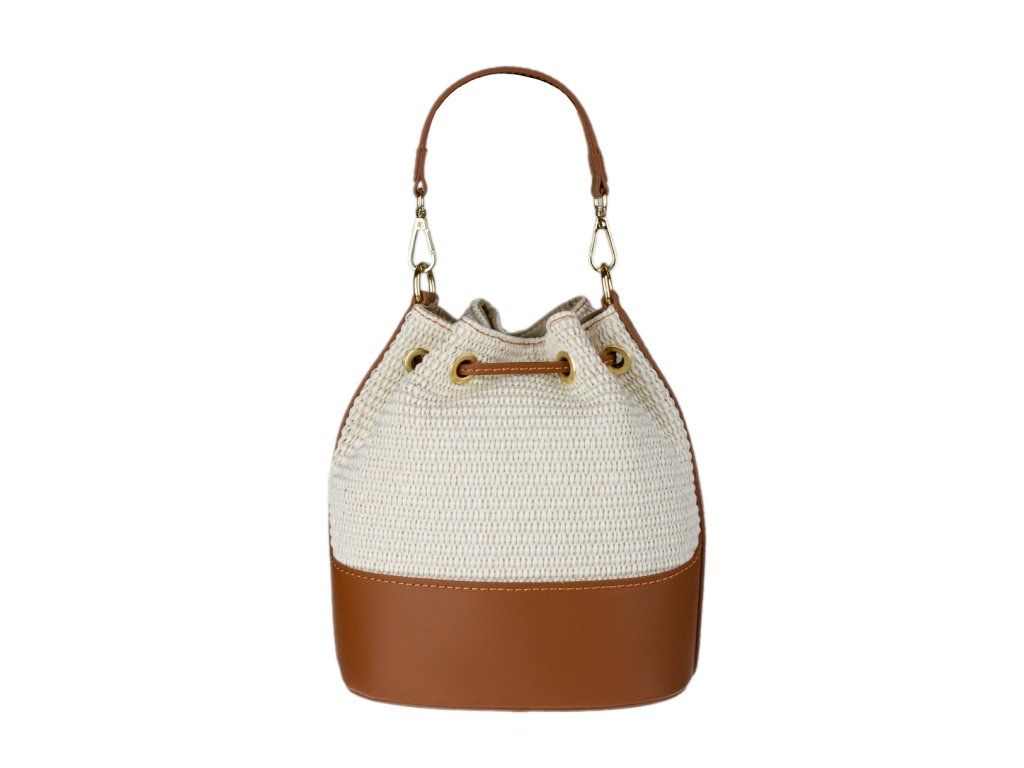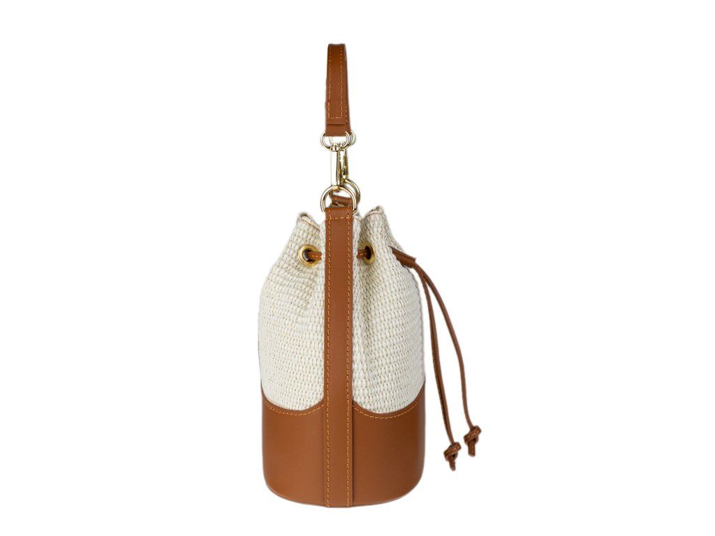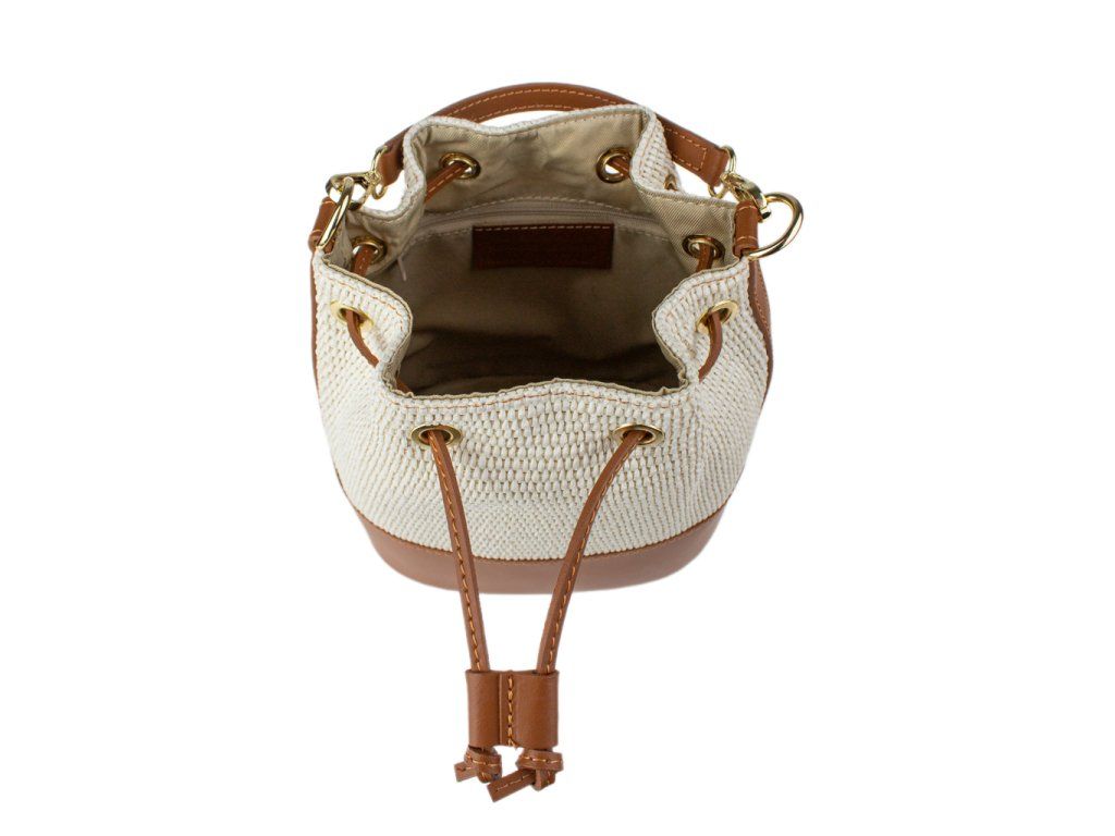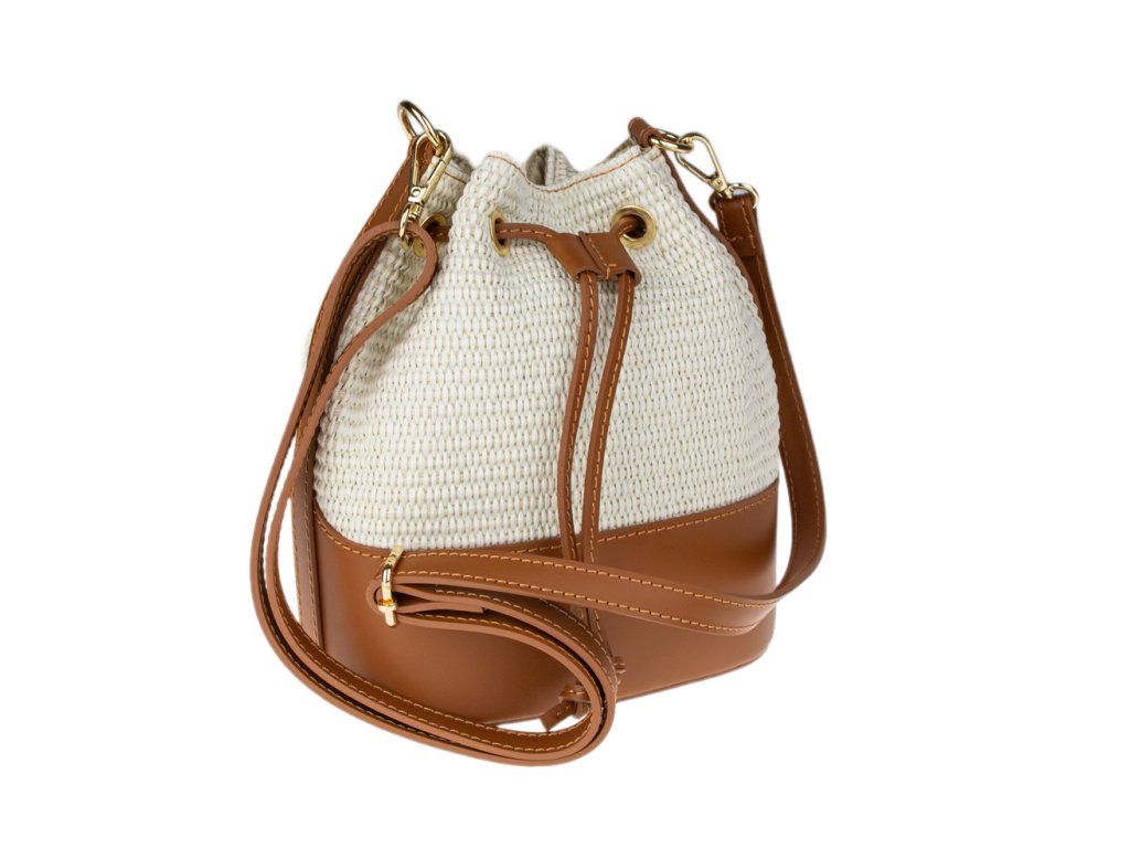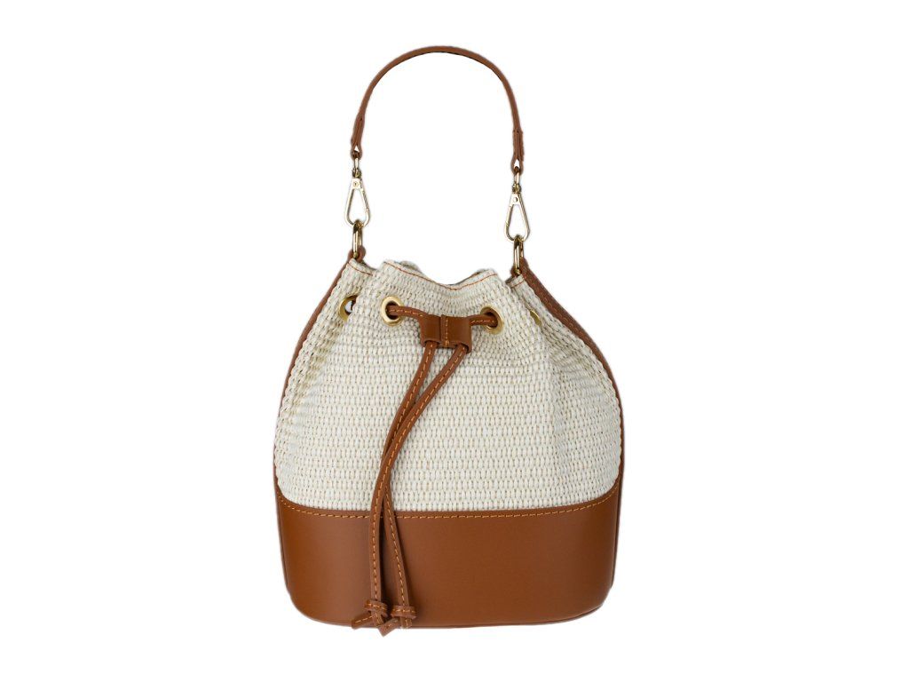 Stylový kontrast: Spojení světlého pleteného těla kabelky s hnědými detaily (dno, popruhy, lemování) působí svěže a velmi moderně.