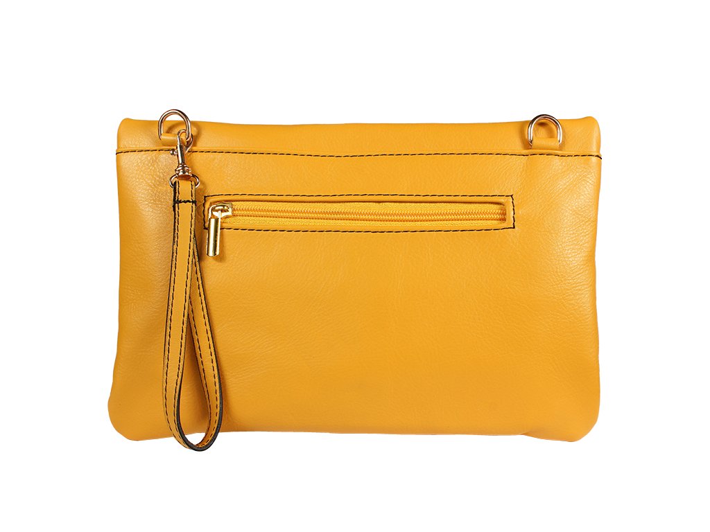 Toto moderní psaníčko vžlutém provedení již na první pohled zaujme kombinací důmyslně tvarovaného zipu a ozdobných třásní. Je vyrobena z příjemné měkké kůže a je možné ji nosit nejen v ruce, ale i přes rameno - s použitím přídavného pásku. Kabelka je velmi praktická, což jistě oceníte např. při běžném nošení nebo na párty.