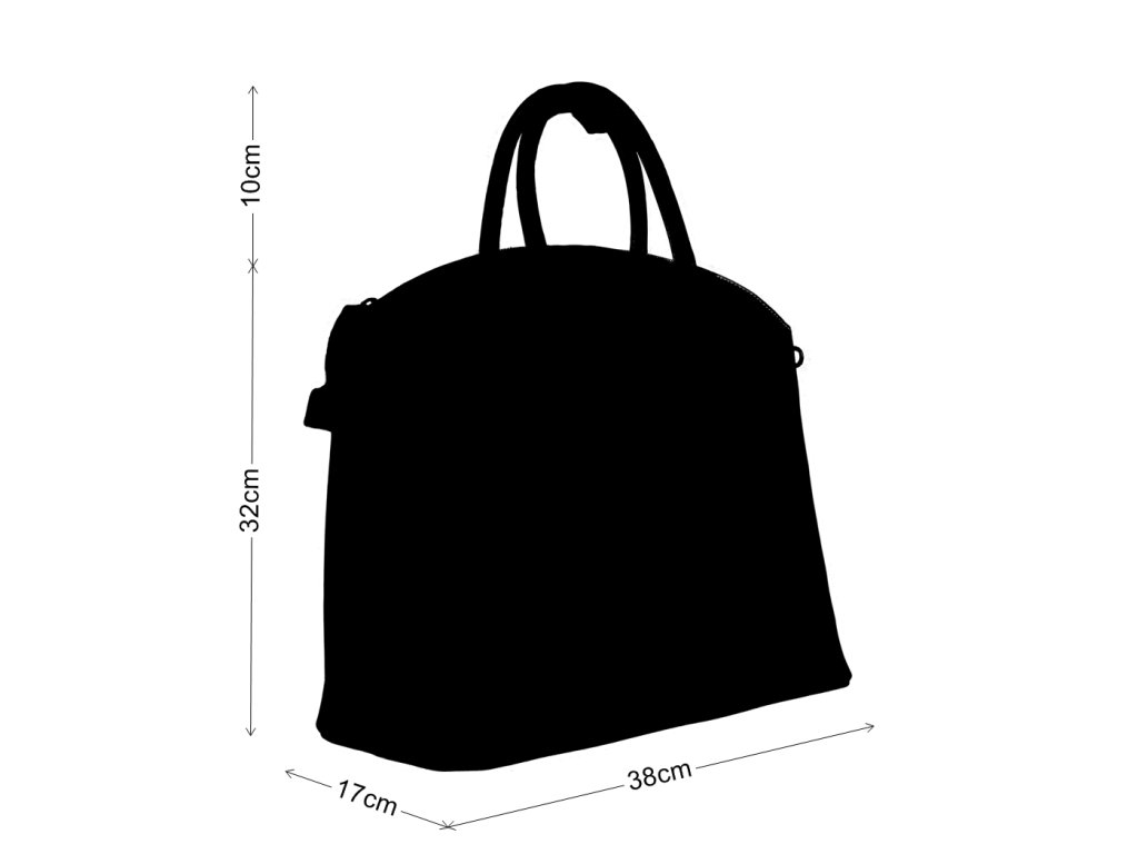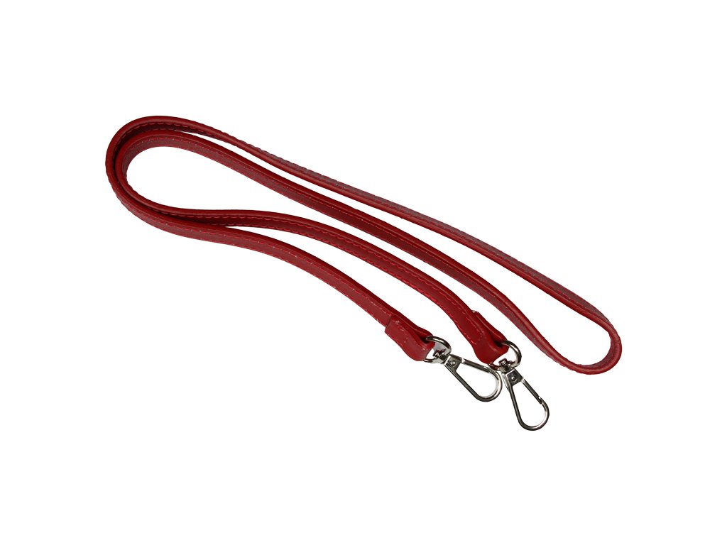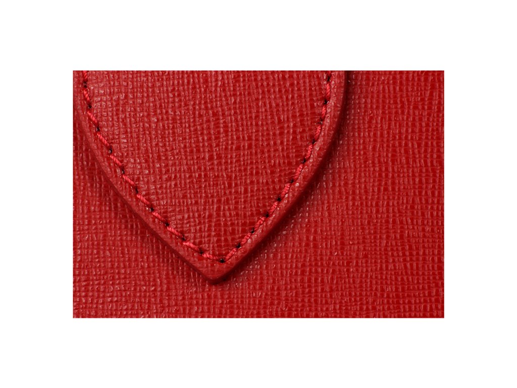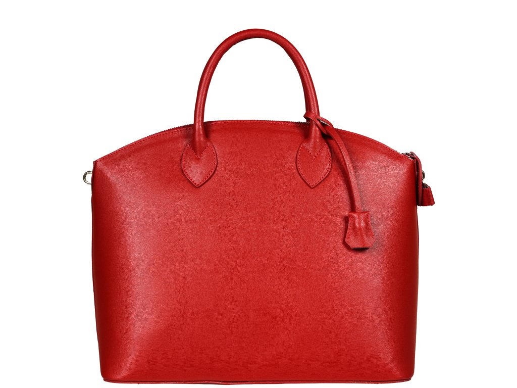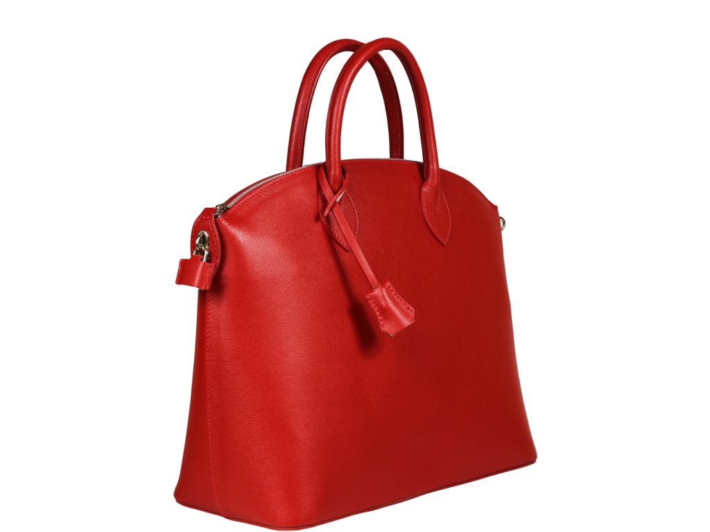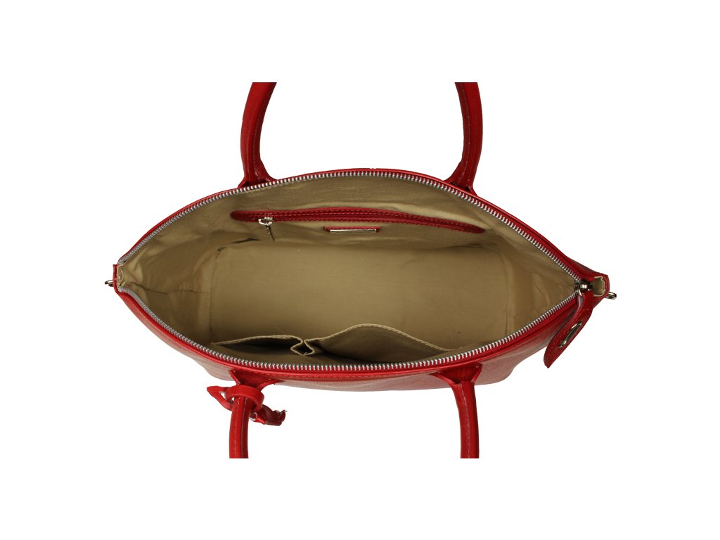 Elegantní kožená kabelka z pravé hovězí kůže v červené barvě. Kabelka je uzavíratelná na zip, který lze zajistit zámečkem stříbrné barvy. Součástí kabelky je přídavný pásek o délce 95 cm. Uvnitř kabelky se nachází tři malé kapsičky. Jedna z nich je uzavíratelná na zip. Do kabelky se vejde s velkou rezervou předmět formátu A4