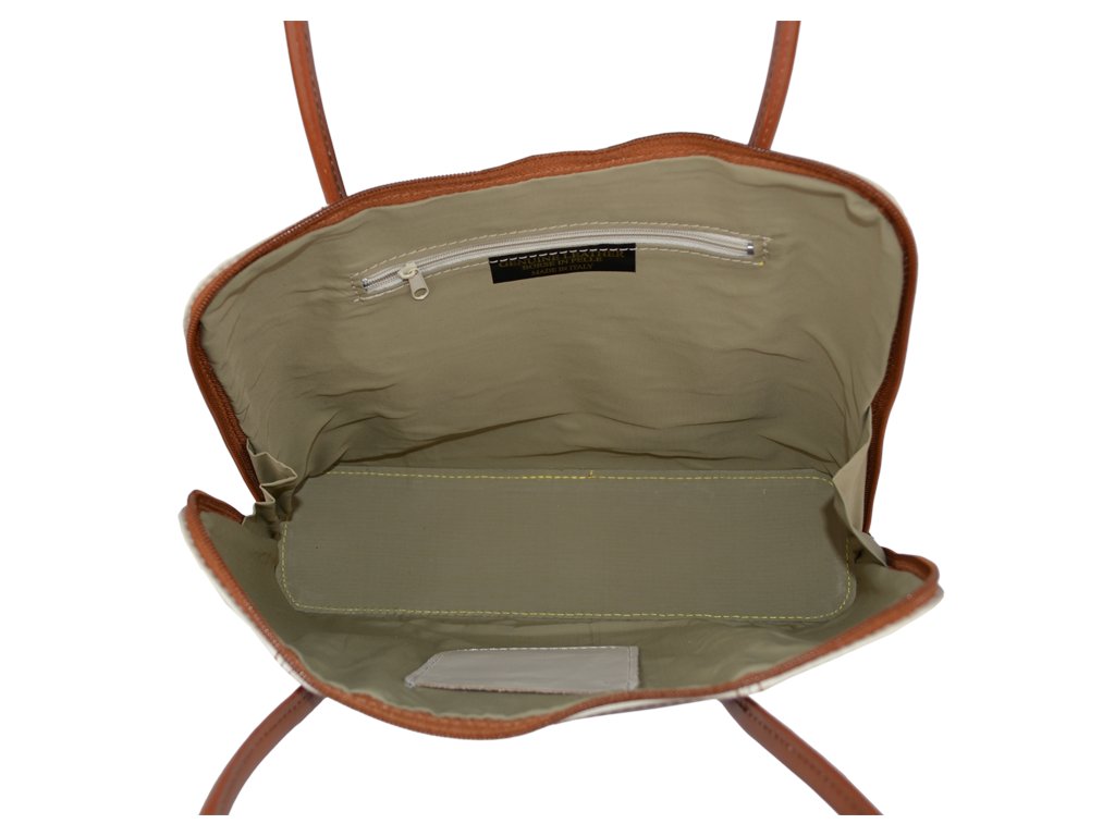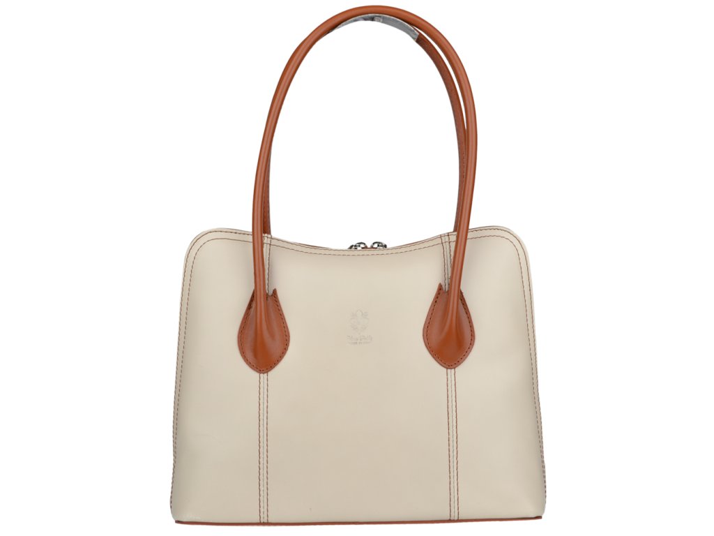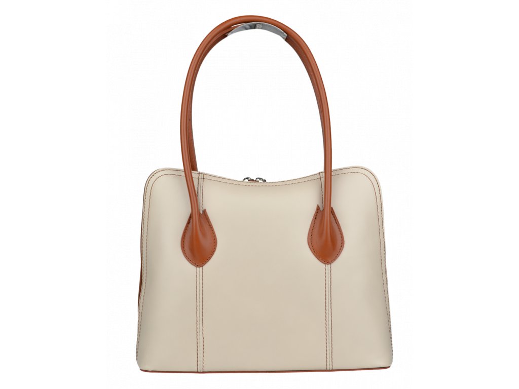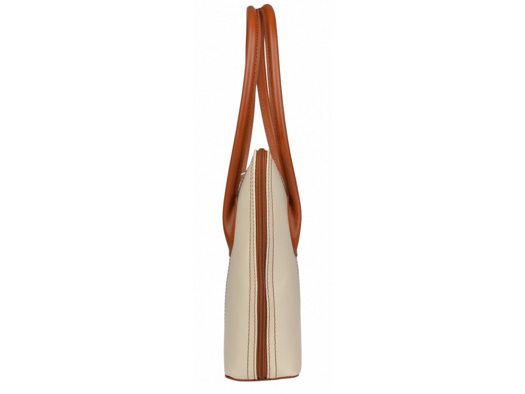 Menší kabelka moderního designu aktovkového tvaru je vyrobená z pevné leštěné kůže v béžové barvě. Tato kožená kabelka je uzavíratelná na zip, který se rozepíná po celém jejím obvodu. Kabelka dobře drží tvar. Vnitřek kabelky nám nabízí kapsu na zip a také malou kapsu na druhé straně. Hloubka jejího dna je 8 cm.