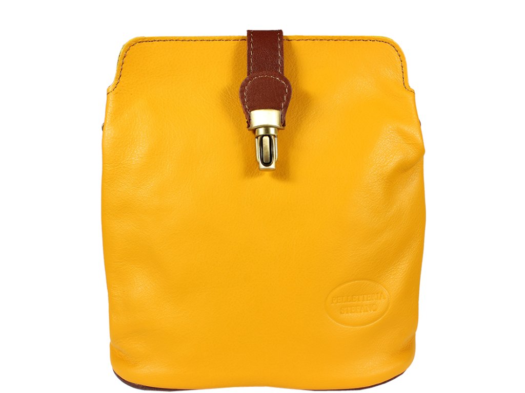 Malá elegantní kabelka v barvě žluté vyrobená z pravé kůže. Tato kožená kabelka je uzavíratelná pomocí cvočků a přezky. Nosí se přes rameno pomocí pásku, jehož plná délka je cca 120 cm. Z vnější strany kabelky je malá kapsa uzavíratelná zipem. Vnitřek kabelky nám nabízí malou kapsu též na zip.