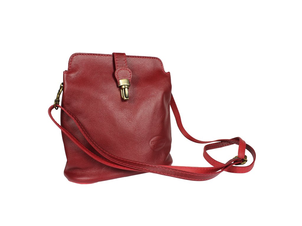Malá elegantní kabelka v barvě červené vyrobená z pravé kůže. Tato kožená kabelka je uzavíratelná pomocí cvočků a přezky. Nosí se přes rameno pomocí pásku, jehož plná délka je cca 120 cm. Z vnější strany kabelky je malá kapsa uzavíratelná zipem. Vnitřek kabelky nám nabízí malou kapsu též na zip.