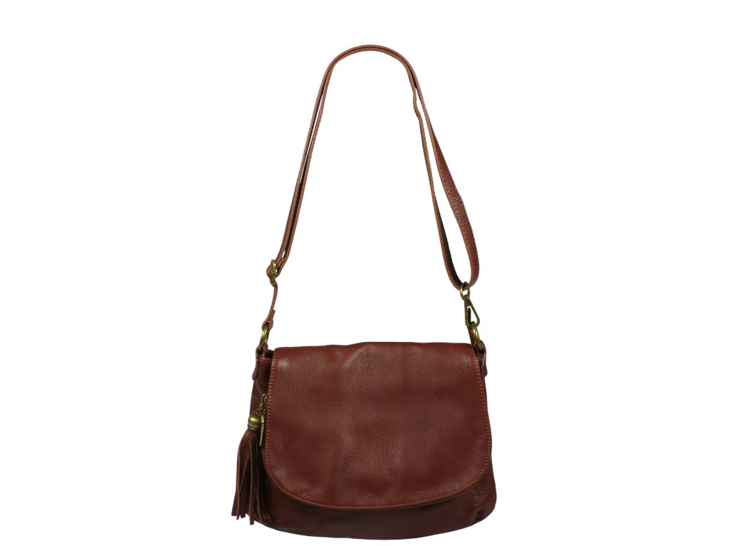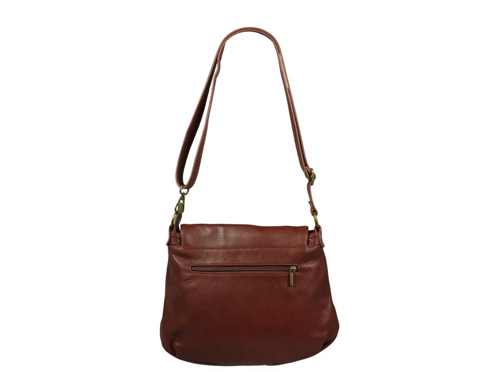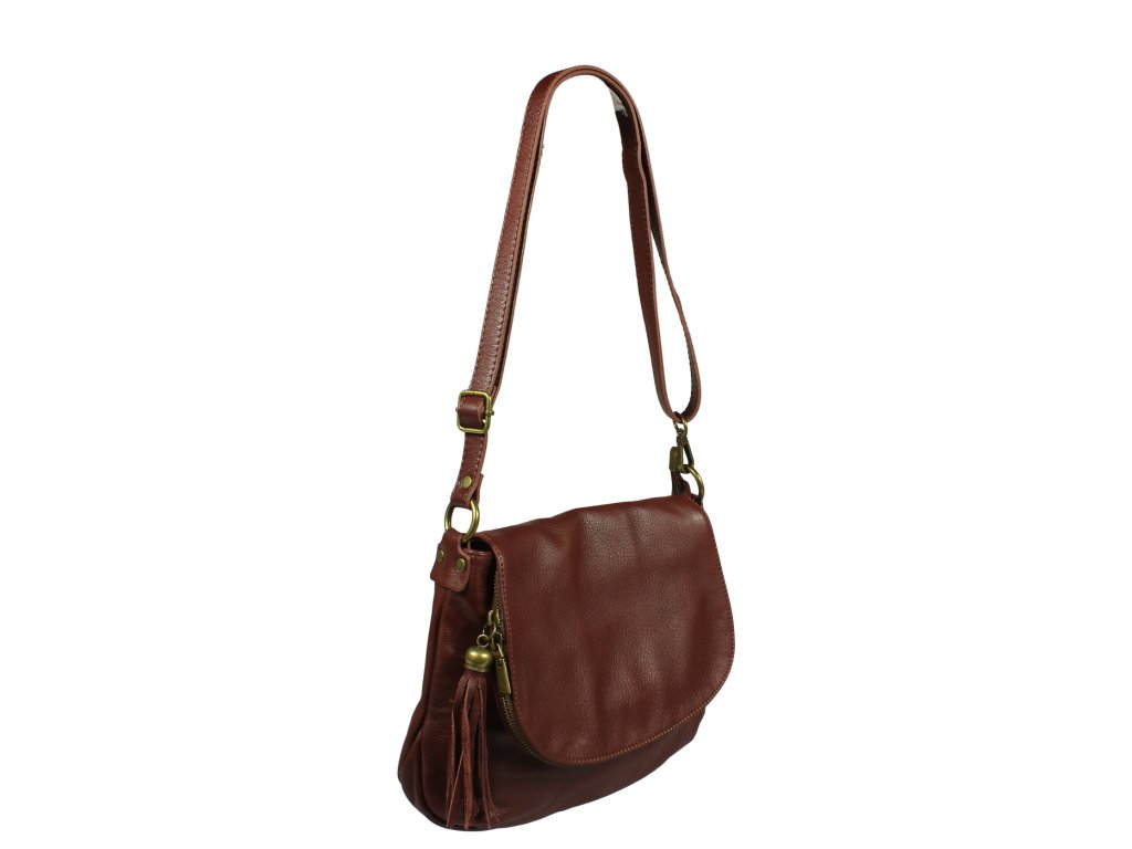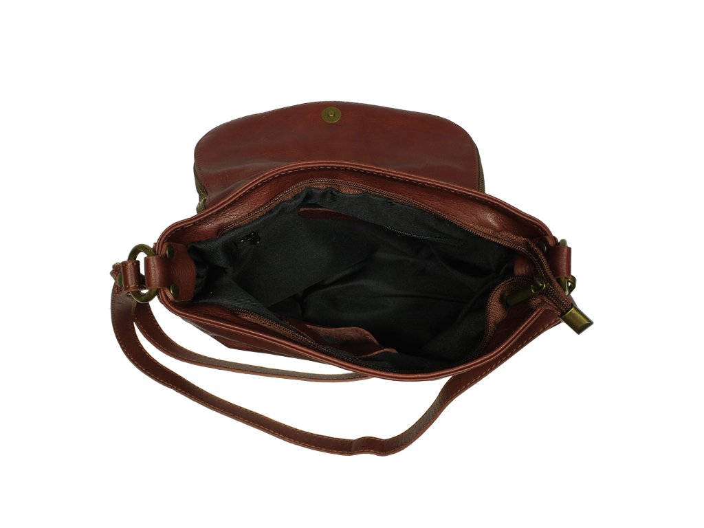 Hnědá kabelka vyrobená z pravé měkké kůže. Je vhodná pro nošení přes rameno a po prodloužení popruhů lze kabelku nosit cross-body (křížem). Kabelka je uzavíratelná patentkou a vnitřní kapsa lze uzavřít na zip. Překlop kabelky s ozdobným zipem a přívěskem lze použít jako další zapínací kapsu.