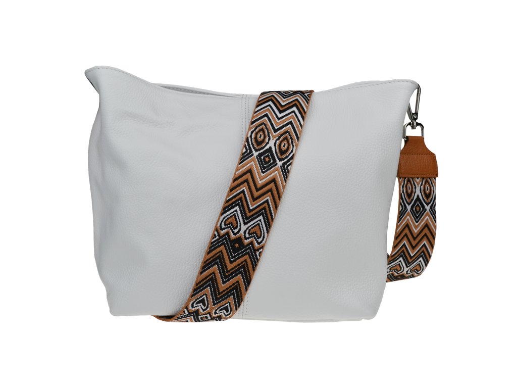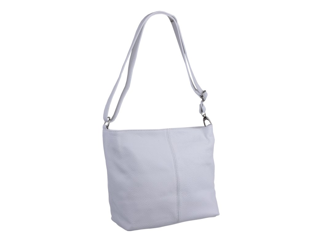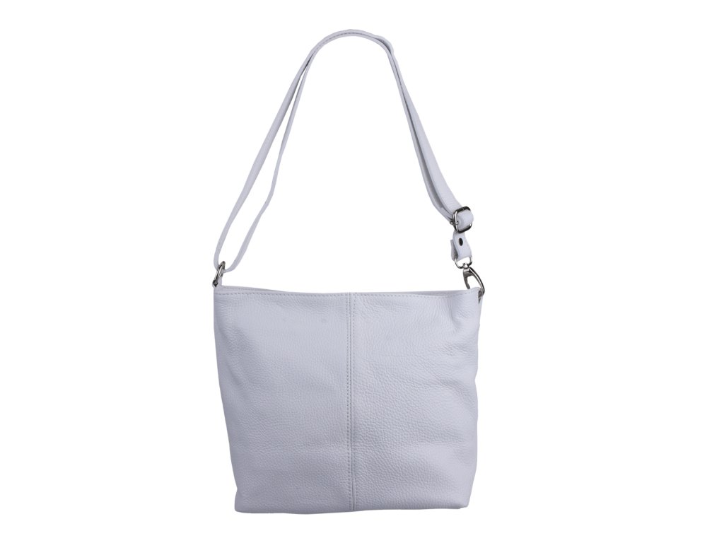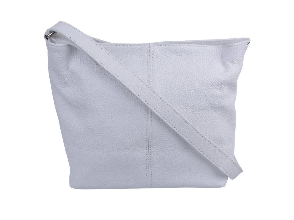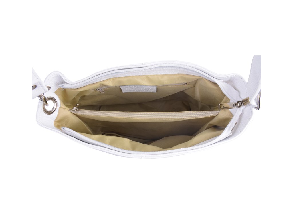 Bílá kabelka nositelná přes rameno či cross-body (křížem). Tato kožená kabelka je uzavíratelná na zip. Uvnitř kabelky najdeme přepážku uprostřed, která zároveň slouží jako kapsa na zip, a na boční stěně pak kapsu na zip. Hloubka jejího dna je 13 cm.