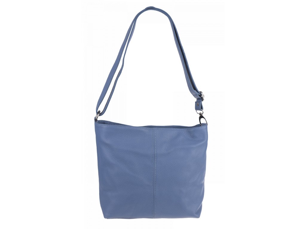 Modrá kabelka nositelná přes rameno či cross-body (křížem). Tato kožená kabelka je uzavíratelná na zip. Uvnitř kabelky najdeme přepážku uprostřed, která zároveň slouží jako kapsa na zip, a na boční stěně pak kapsu na zip. Hloubka jejího dna je 13 cm. Kabelka má navíc nastavitelný popruh s maximální délkou cca 120 cm.