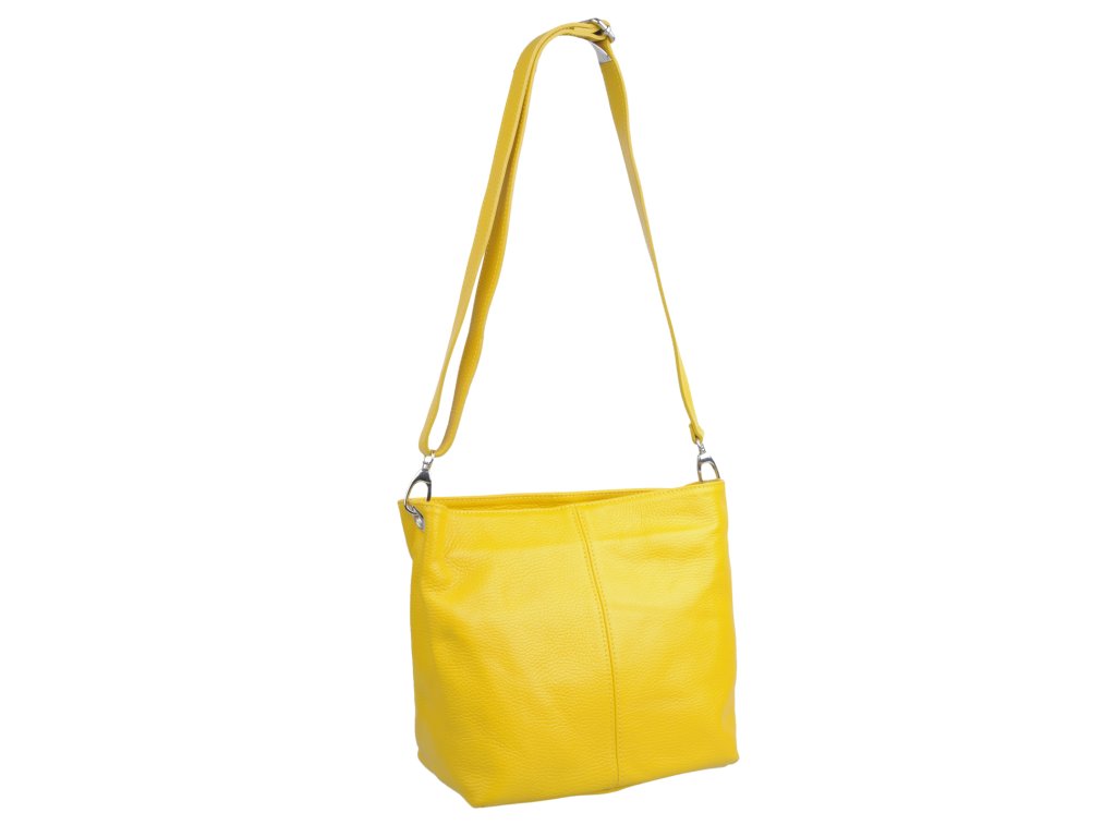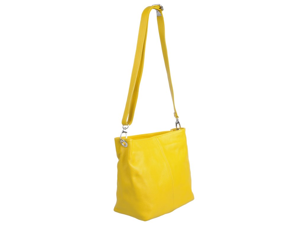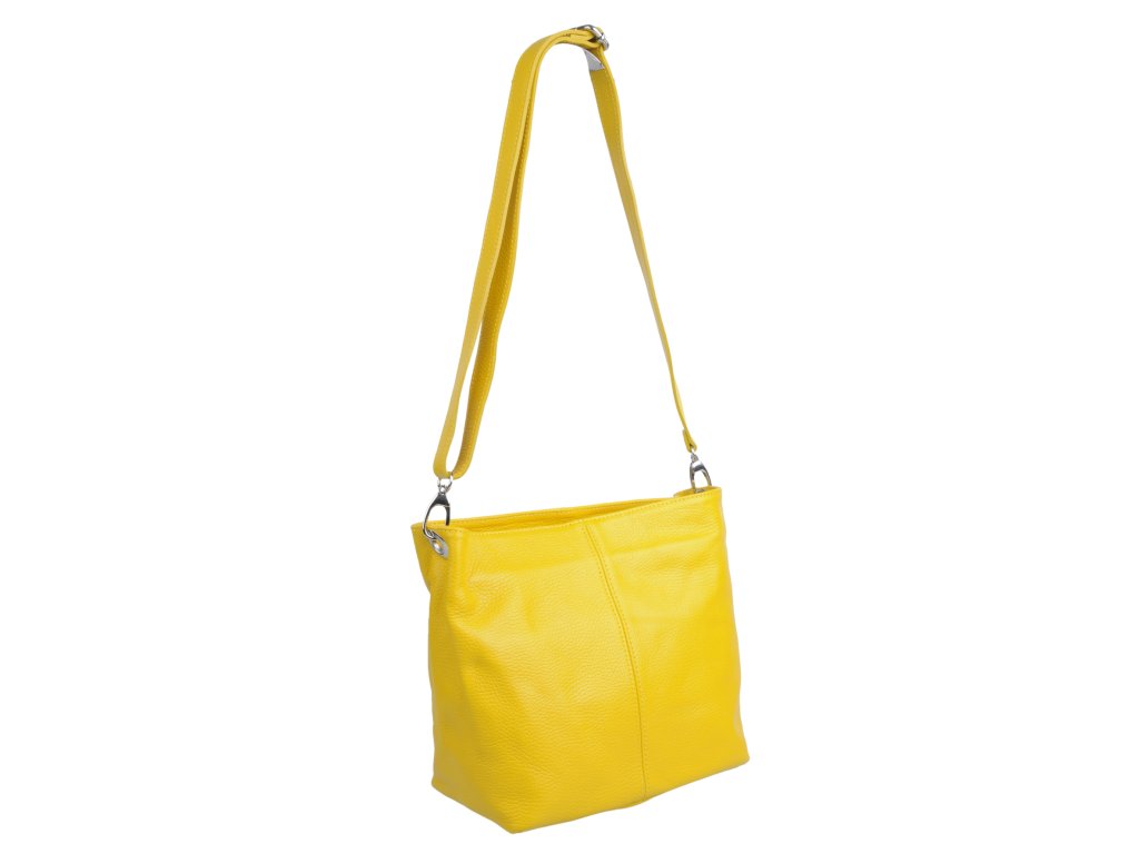 Žlutá kabelka nositelná přes rameno či cross-body (křížem). Tato kožená kabelka je uzavíratelná na zip. Uvnitř kabelky najdeme přepážku uprostřed, která zároveň slouží jako kapsa na zip, a na boční stěně pak kapsu na zip. Hloubka jejího dna je 13 cm. Kabelka má navíc nastavitelný popruh s maximální délkou cca 120 cm.
