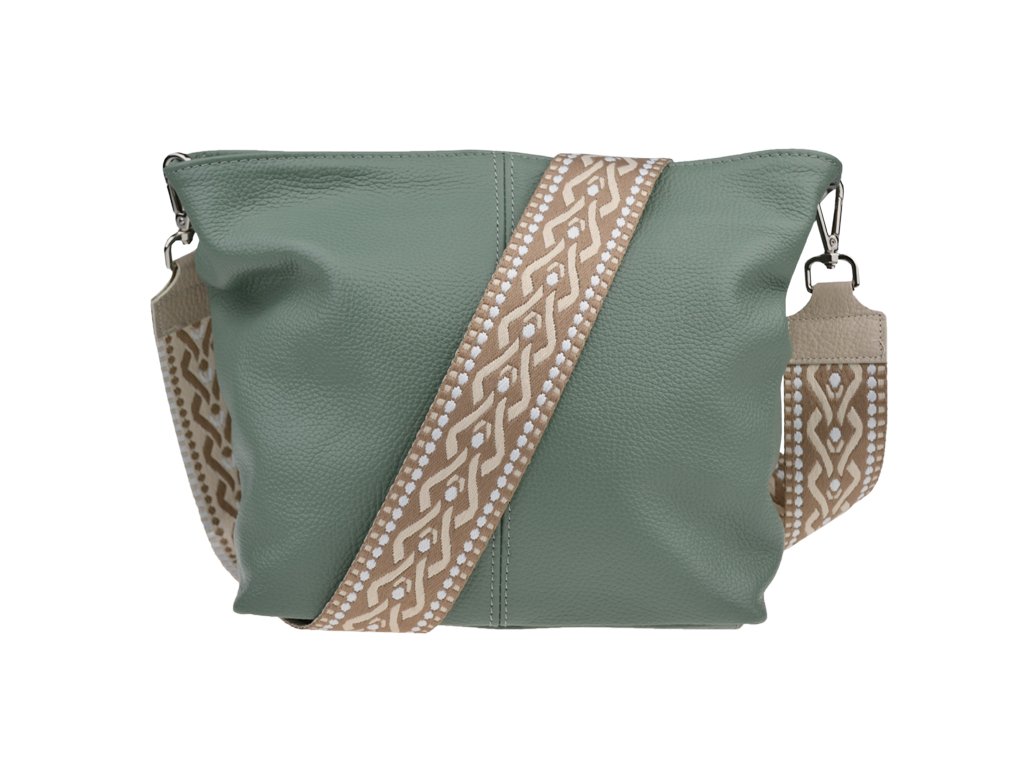 Zelená kabelka nositelná přes rameno či cross-body (křížem). Tato kožená kabelka je uzavíratelná na zip. Uvnitř kabelky najdeme přepážku uprostřed, která zároveň slouží jako kapsa na zip, a na boční stěně pak kapsu na zip. Hloubka jejího dna je 13 cm.