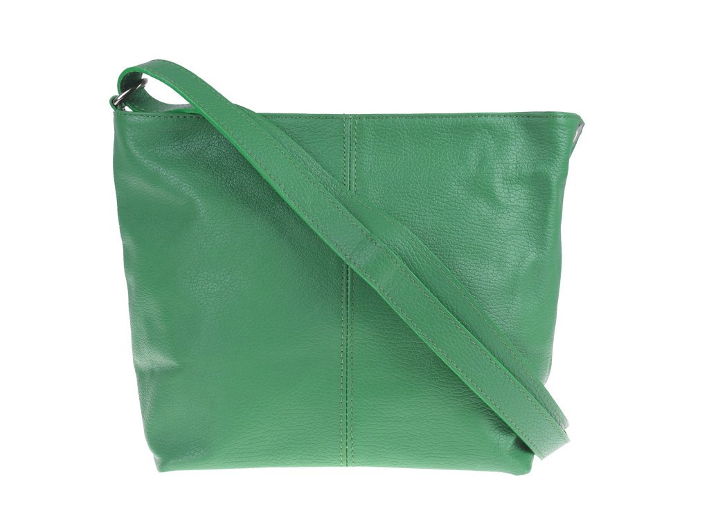 Zelená kabelka nositelná přes rameno či cross-body (křížem). Tato kožená kabelka je uzavíratelná na zip. Uvnitř kabelky najdeme přepážku uprostřed, která zároveň slouží jako kapsa na zip, a na boční stěně pak kapsu na zip. Hloubka jejího dna je 13 cm. Kabelka má navíc nastavitelný popruh s maximální délkou cca 120 cm.
