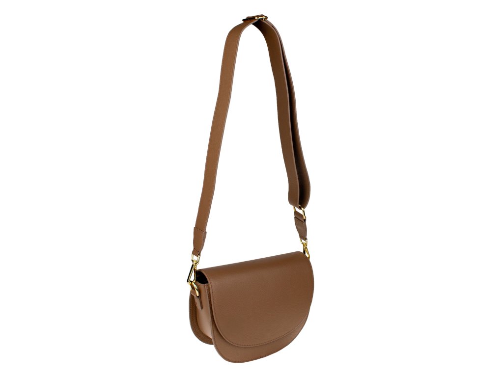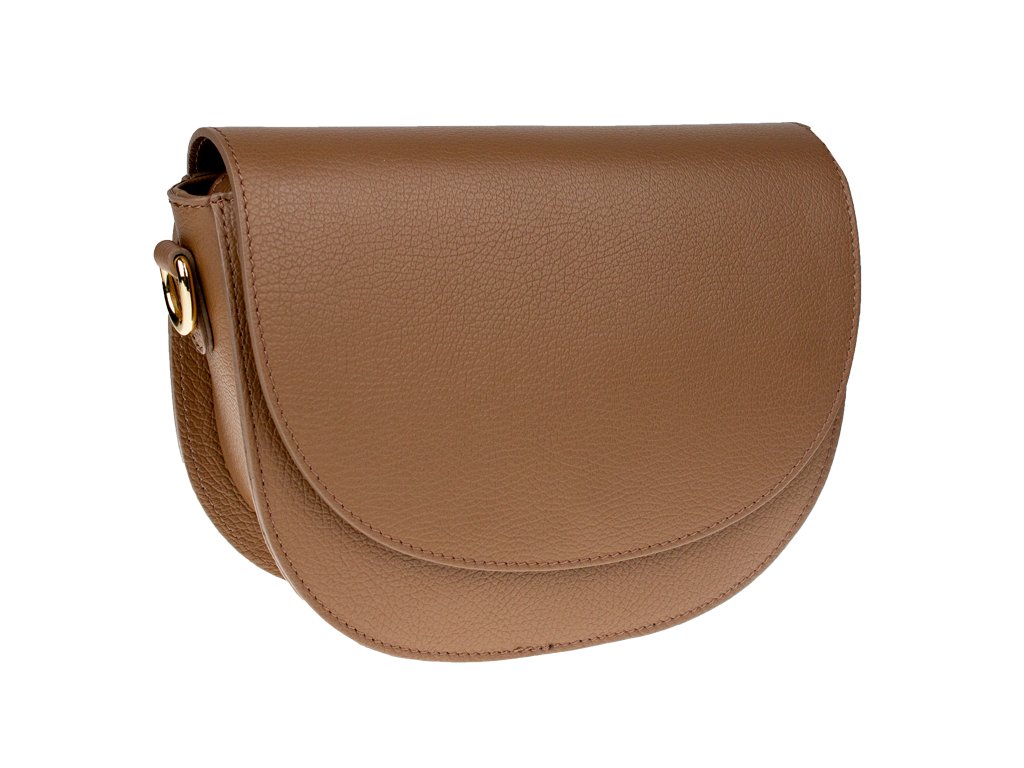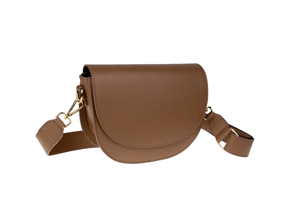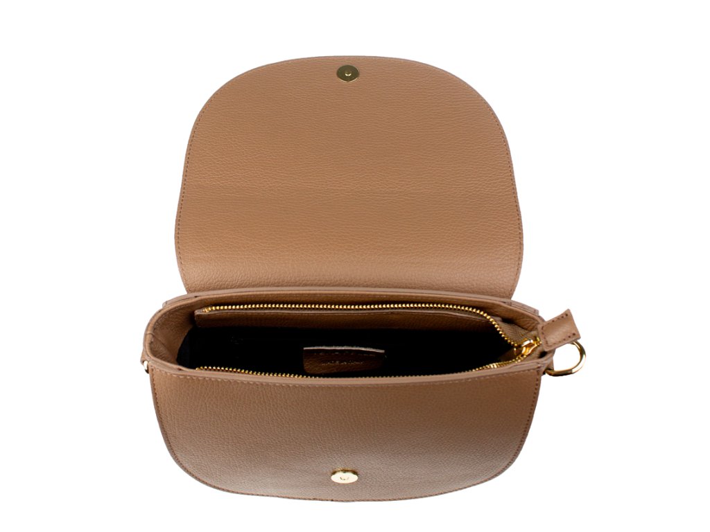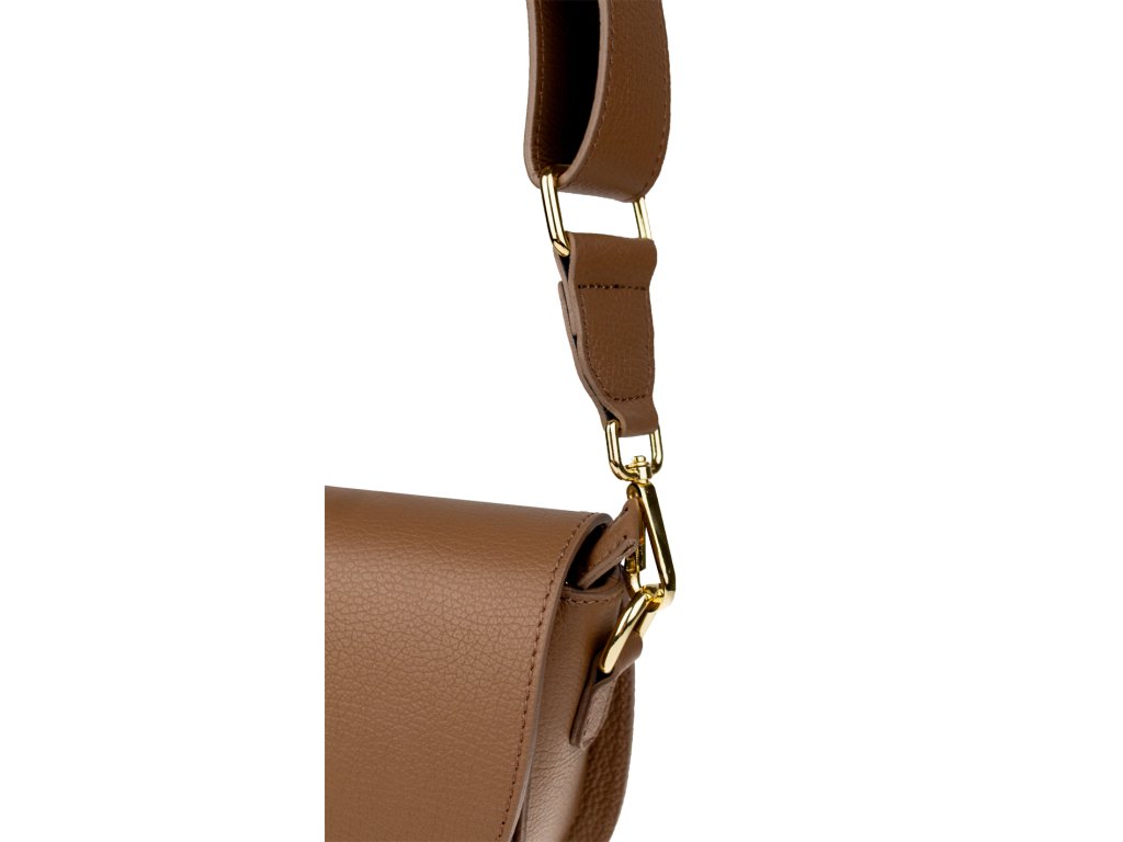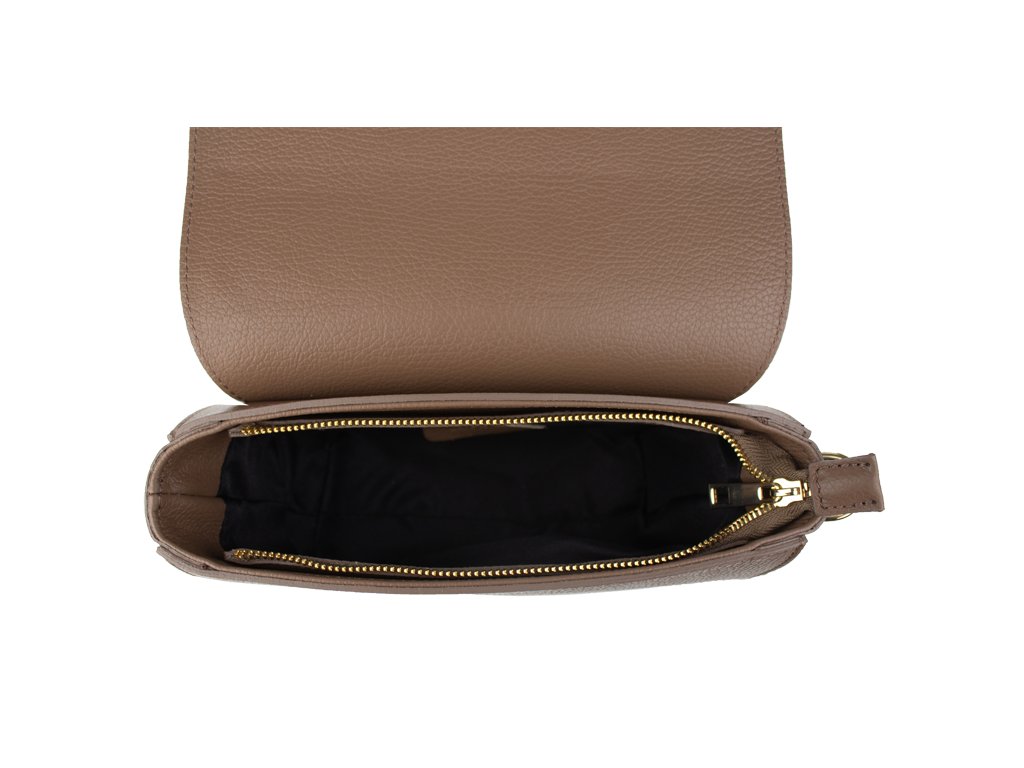 Hnědá kabelka nositelná přes rameno či cross-body (křížem). Tato kožená kabelka je uzavíratelná na patentku a uvnitř nalezneme přihrádku na zip. Kabelka má nastavitelný popruh s maximální délkou cca 140cm.