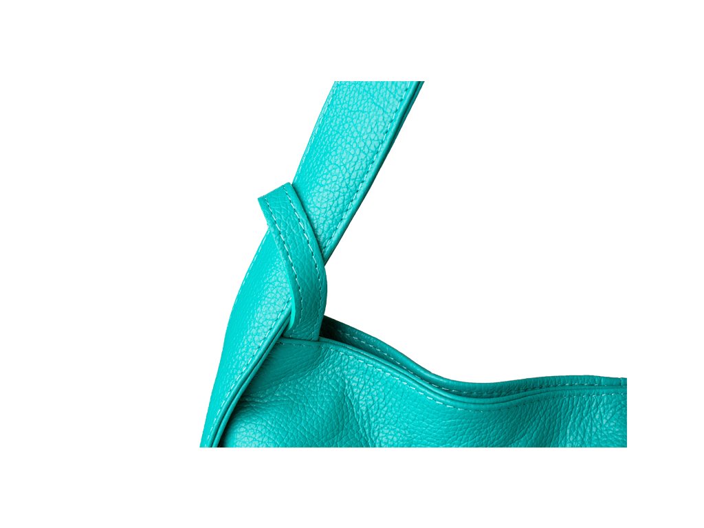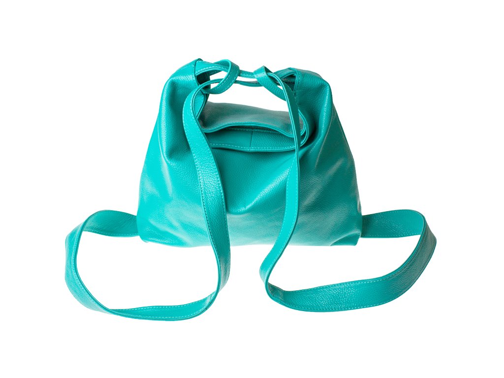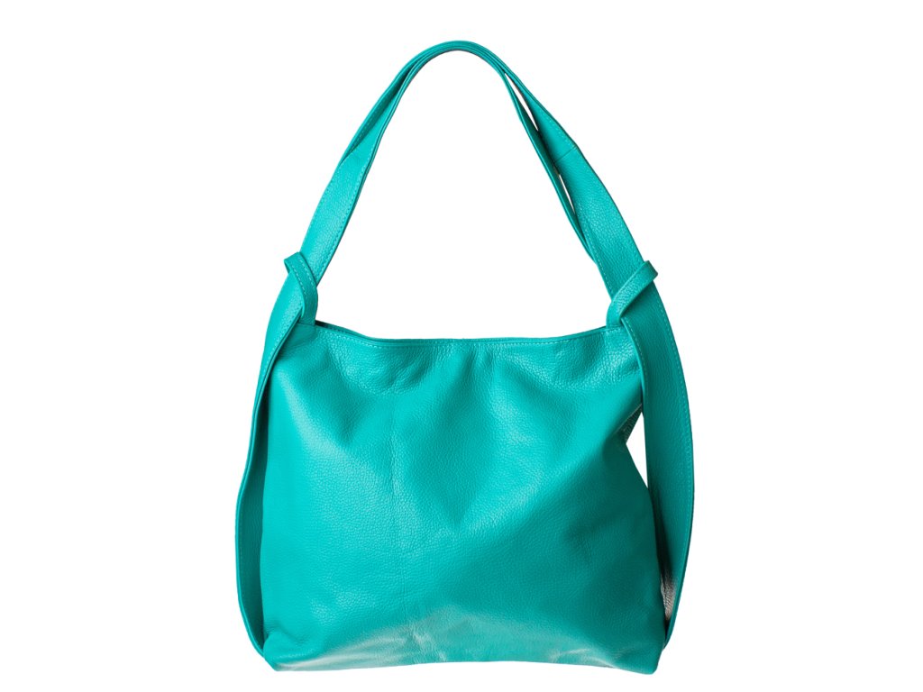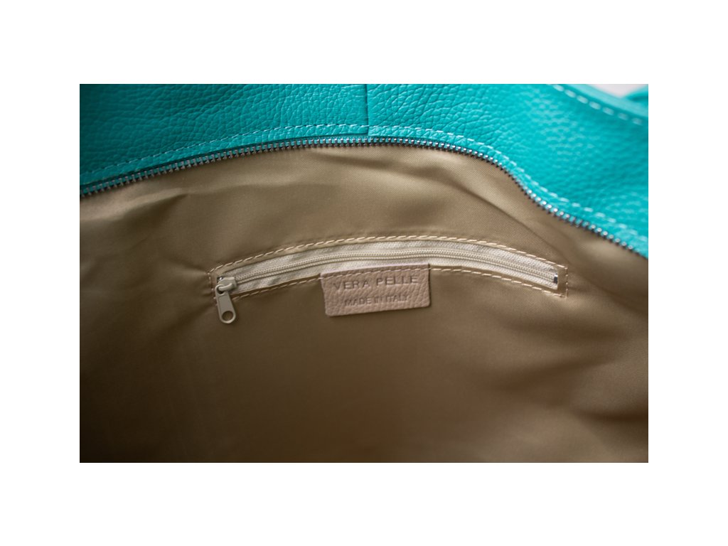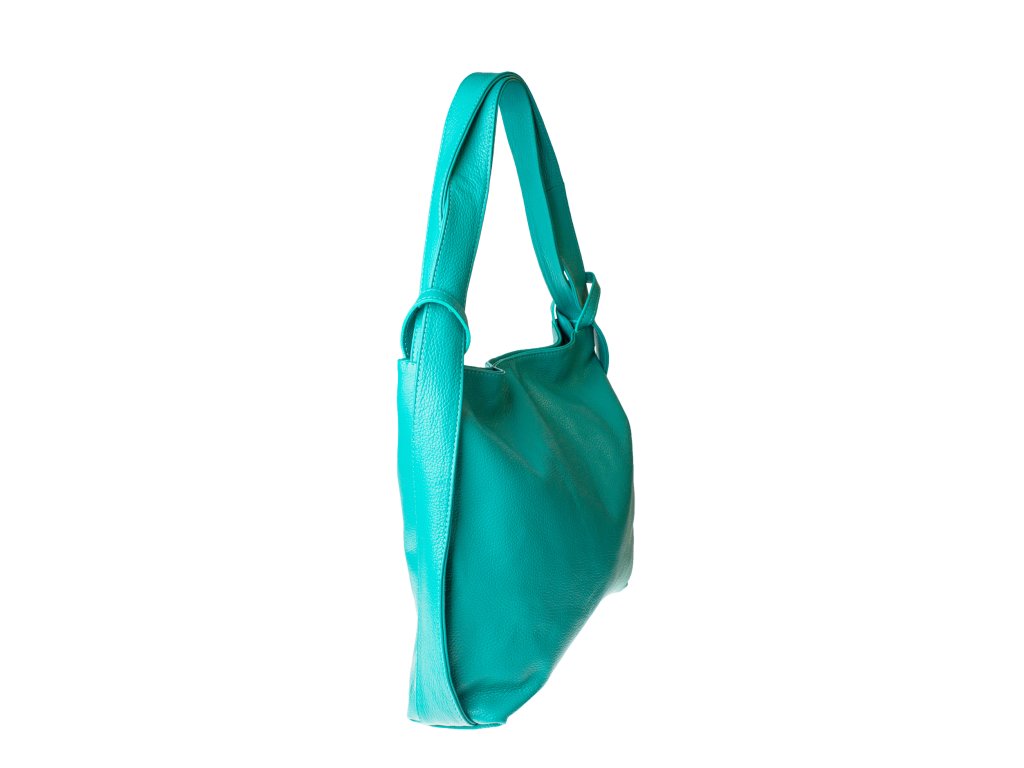 Krásná kožená kabelka s jednoduchým designem v tyrkysové barvě. Tato kožená kabelka je uzavíratelná pomocí zipu. Disponuje pohodlnými uchy dostatečné délky, takže jí lze nosit pohodlně přes rameno nebo jako batůžek. Pohodlně se do ní vejdou dokumenty formátu A4.
