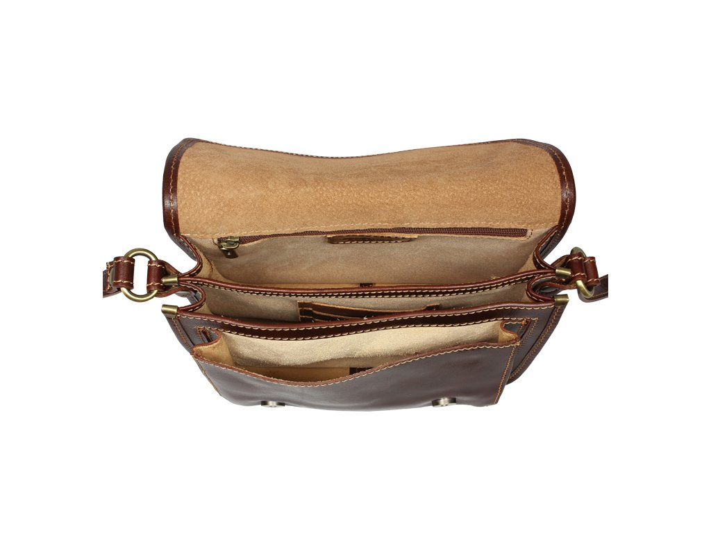 Kožená kabelka v hnědé barvě. Kabelka se uzavírá pomocí poklopu na patentky. Uvnitř kabelky jsou tři přihrádky a zavírací kapsa na zip.