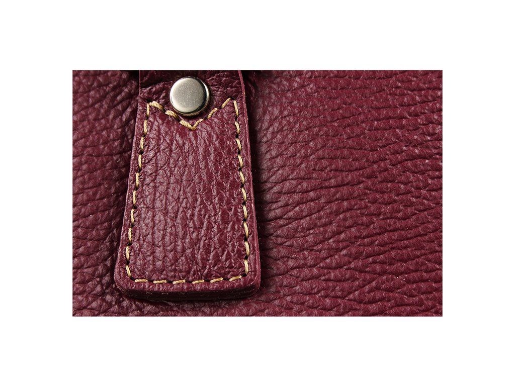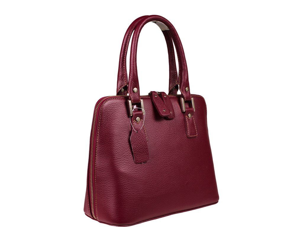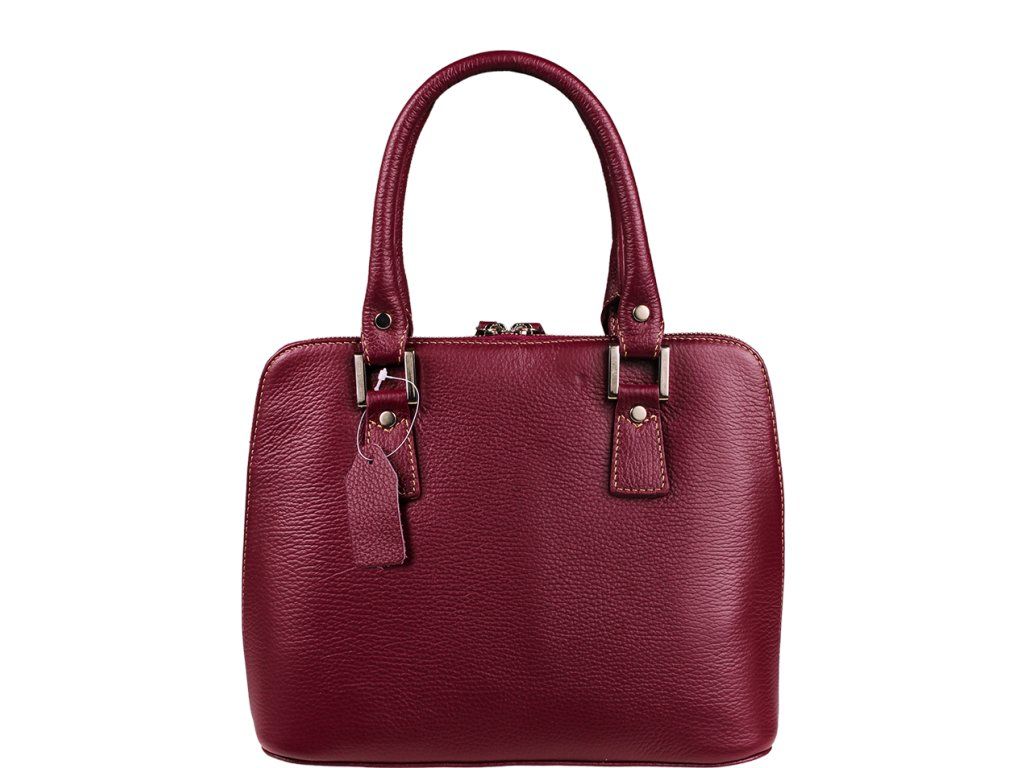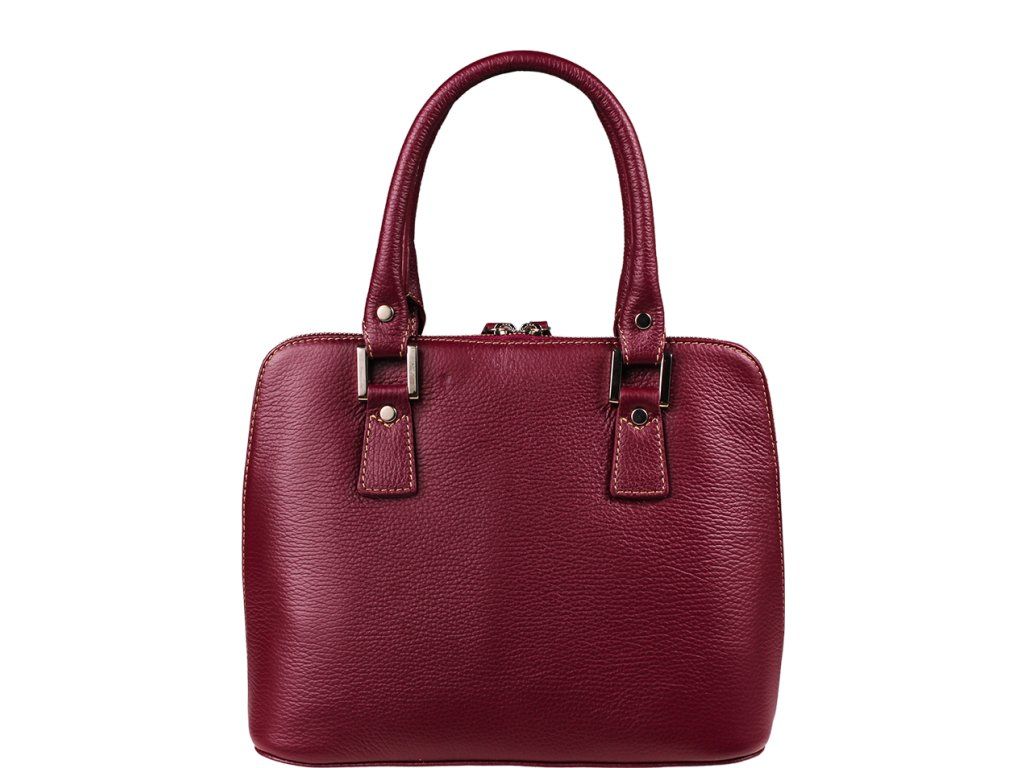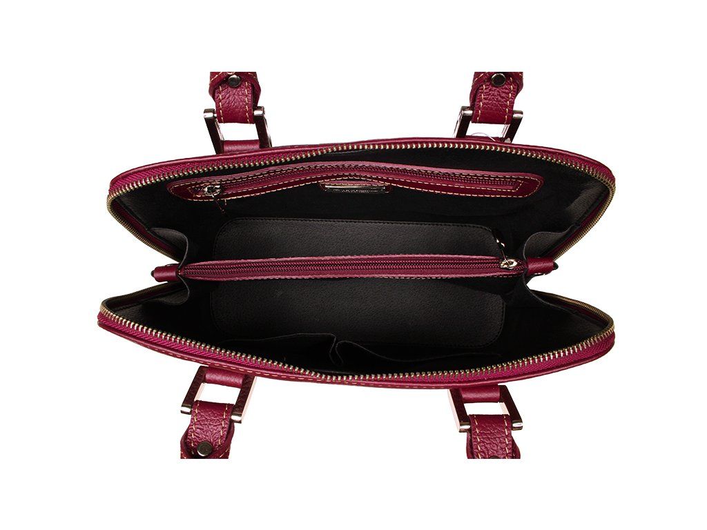 Menší fialová kabelka moderního designu je velmi kvalitně zpracována. Je vhodná pro nošení do ruky. Tato kožená kabelka je uzavíratelná na zip, který se rozepíná po celém jejím obvodu. Kabelka je vyrobená z poctivé odolné kůže a dobře drží tvar. Uvnitř kabelky najdeme přepážku uprostřed, která zároveň slouží jako kapsa na zip a na bočních stěnách pak kapsu na zip a 2 malé kapsy. Kabelka má navíc nastavitelný popruh s maximální délkou cca 120 cm.
