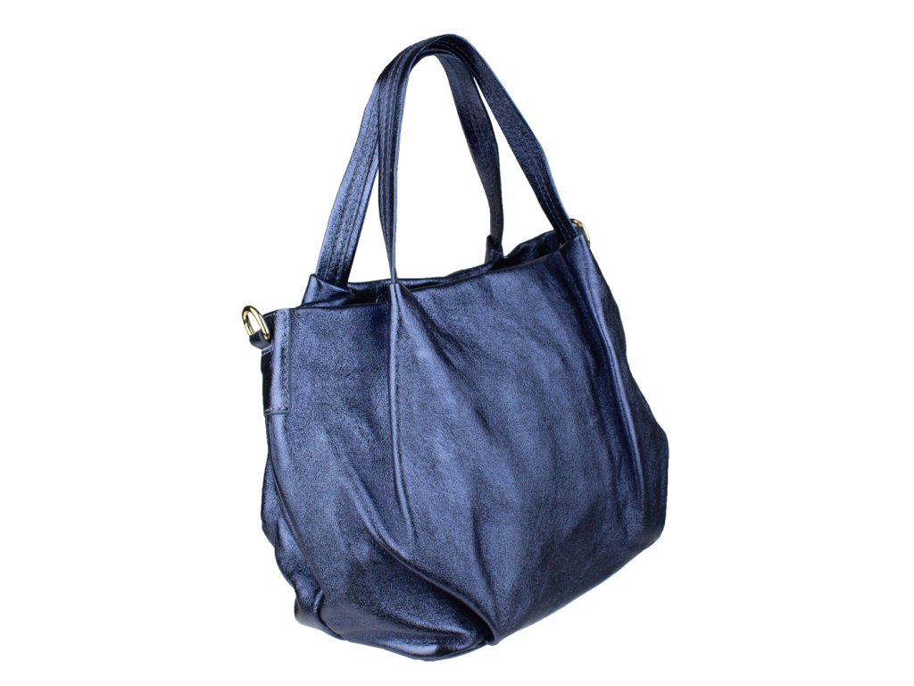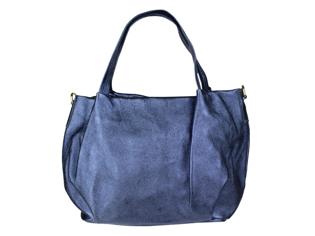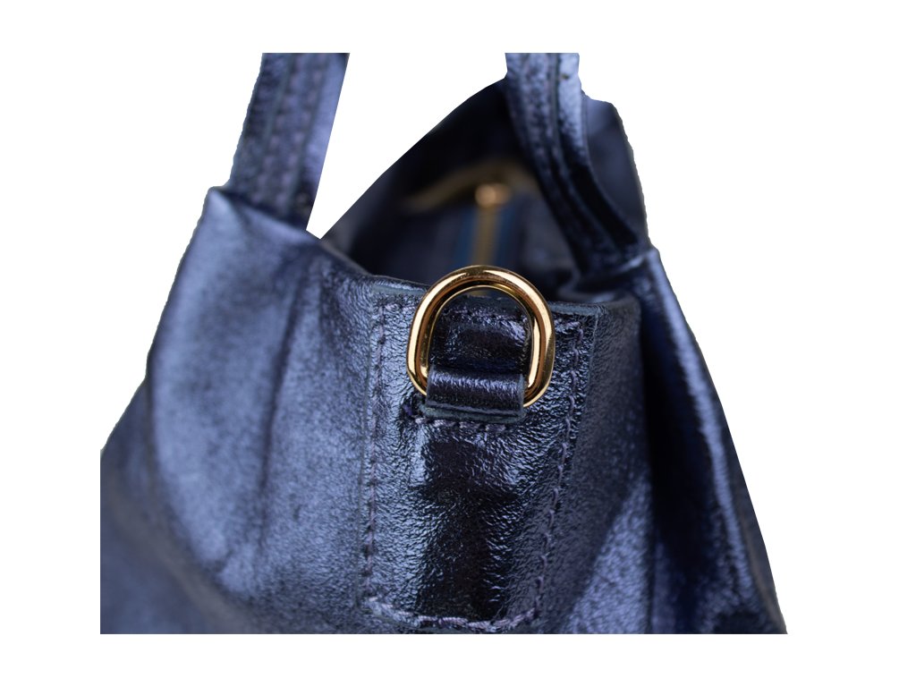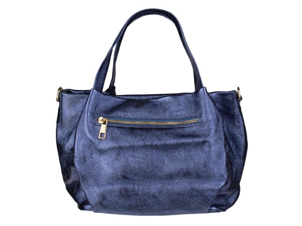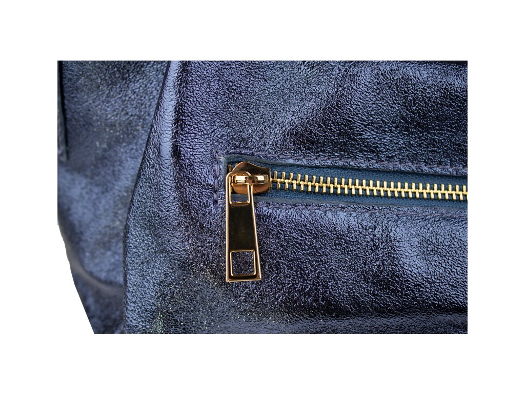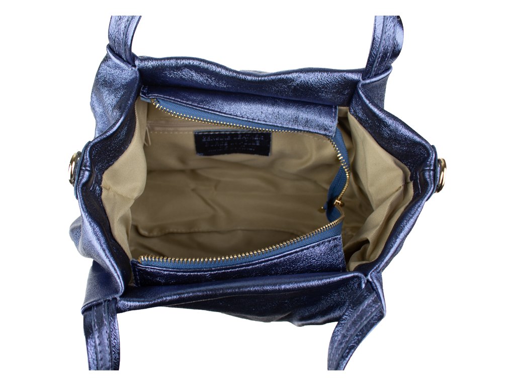 Elegantní a praktická metalicky - modrá kabelka nositelná cross-body (křížem) nebo v ruce. Tato kožená kabelka je uzavíratelná na zip. Uvnitř kabelky najdeme na boční stěně kapsu na zip a přihrádky pro mobil či klíče. Hloubka jejího dna je 13 cm. Kabelka má navíc nastavitelný popruh s maximální délkou cca 120 cm.
