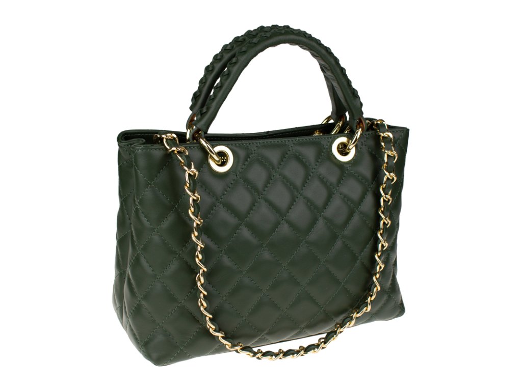 Kabelka je vybavena pevnými pletenými koženými uchy pro nošení v ruce a elegantním zlatým řetězem pro nošení přes rameno nebo crossbody. Kovové detaily ve zlatém tónu podtrhují luxusní vzhled.