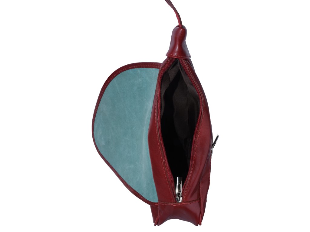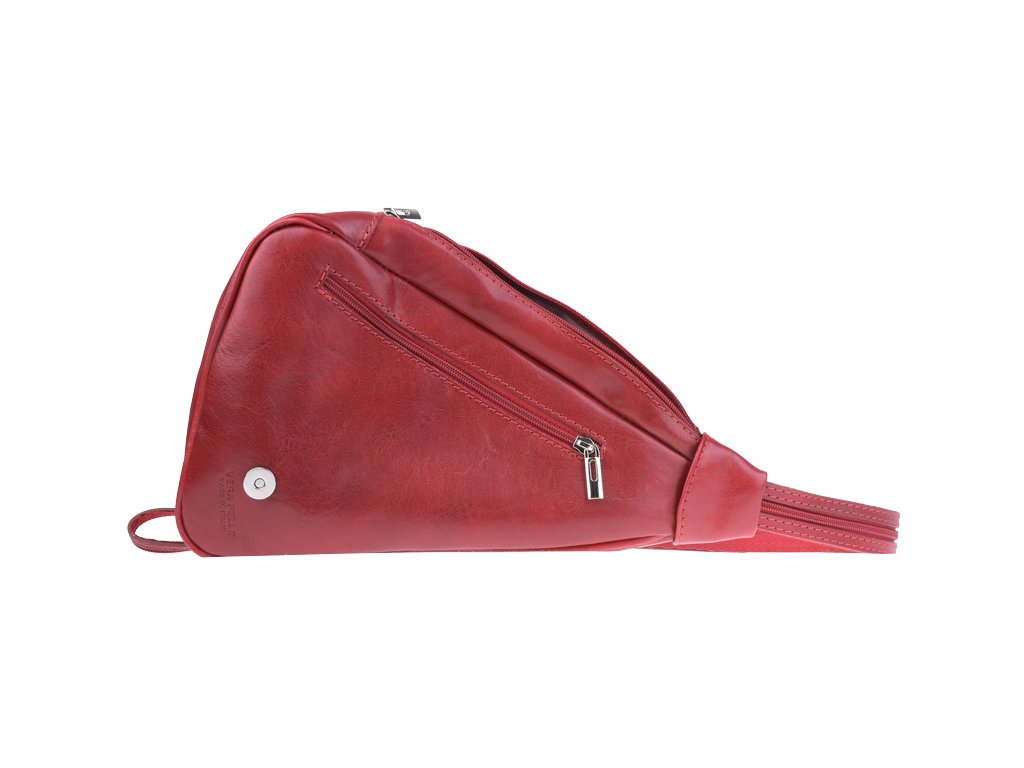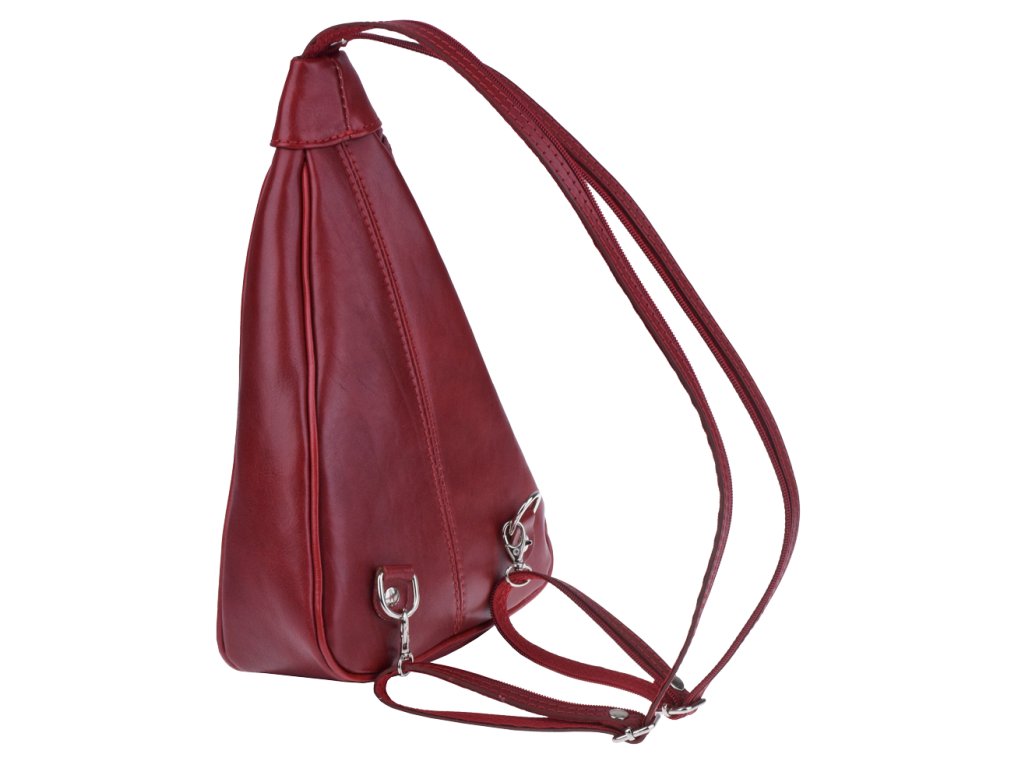Jedinečný kožený batůžek v červené barvě se zajímavým tvarem. Dominantní je kovový detail (zapínání) na přední straně. Batůžek se otevírá z boku a vevnitř najdete malou kapsu na zip. Velmi zajímavé je provedení popruhů batůžku, popruhy se rozepínají pomocí zipu, čímž si můžete určovat způsob nošení batůžku.