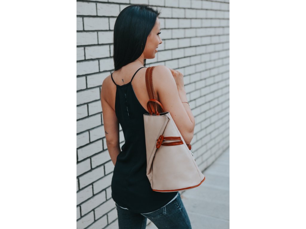 Jedinečný kožený batůžek se zajímavým tvarem. Dominantním prvkem kabelky je její zapínání na kožený knoflík. Zvenku u uvnitř kabelky můžete využít malé zapínací kapsy na zip pro Váš mobil či klíče. Velmi zajímavé je provedení popruhů batůžku, popruhy lze upravit zipem a tím si můžete určit způsob nošení batůžku.