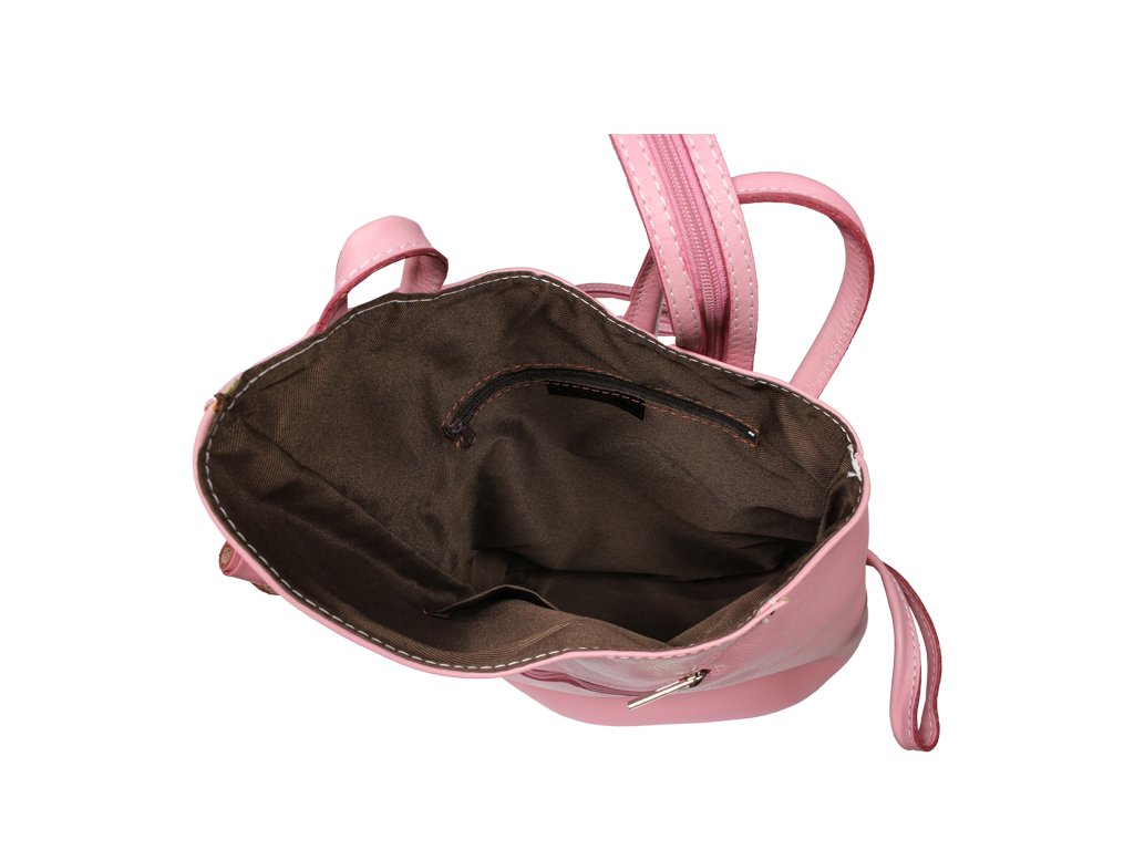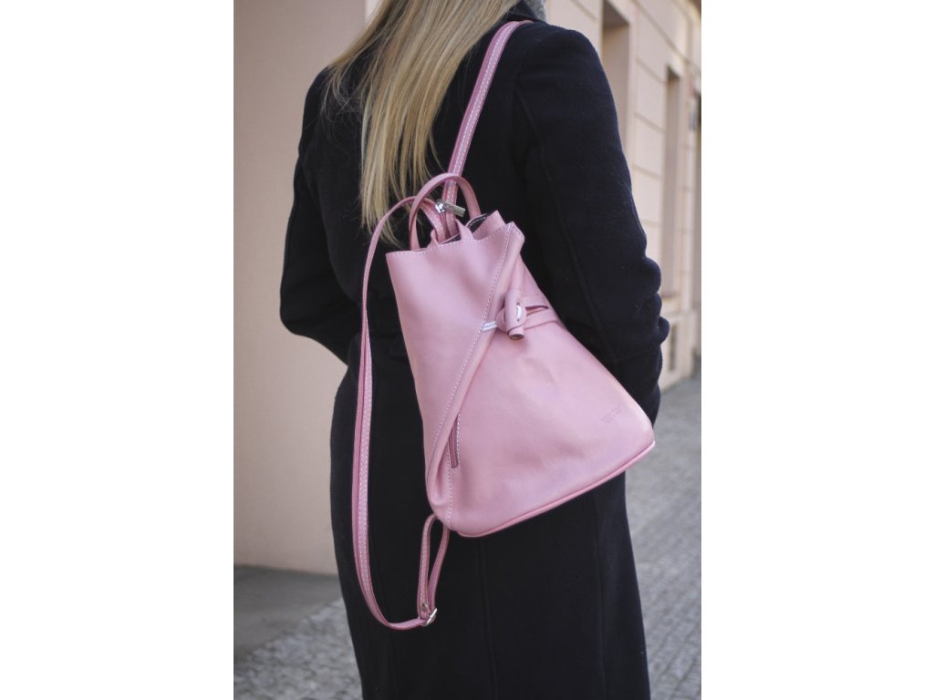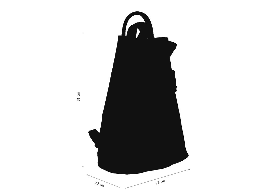 Jedinečný kožený batůžek se zajímavým tvarem. Dominantním prvkem kabelky je její zapínání na kožený knoflík. Zvenku u uvnitř kabelky můžete využít malé zapínací kapsy na zip pro Váš mobil či klíče. Velmi zajímavé je provedení popruhů batůžku, popruhy lze upravit zipem a tím si můžete určit způsob nošení batůžku.