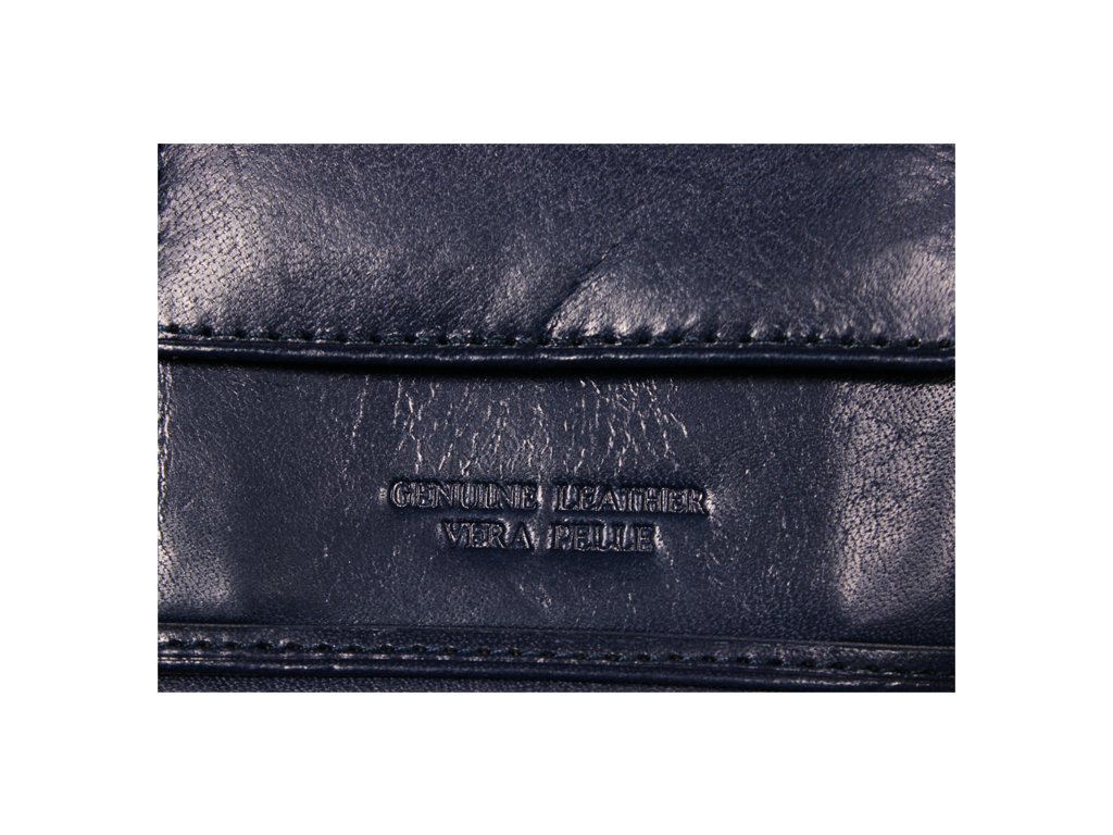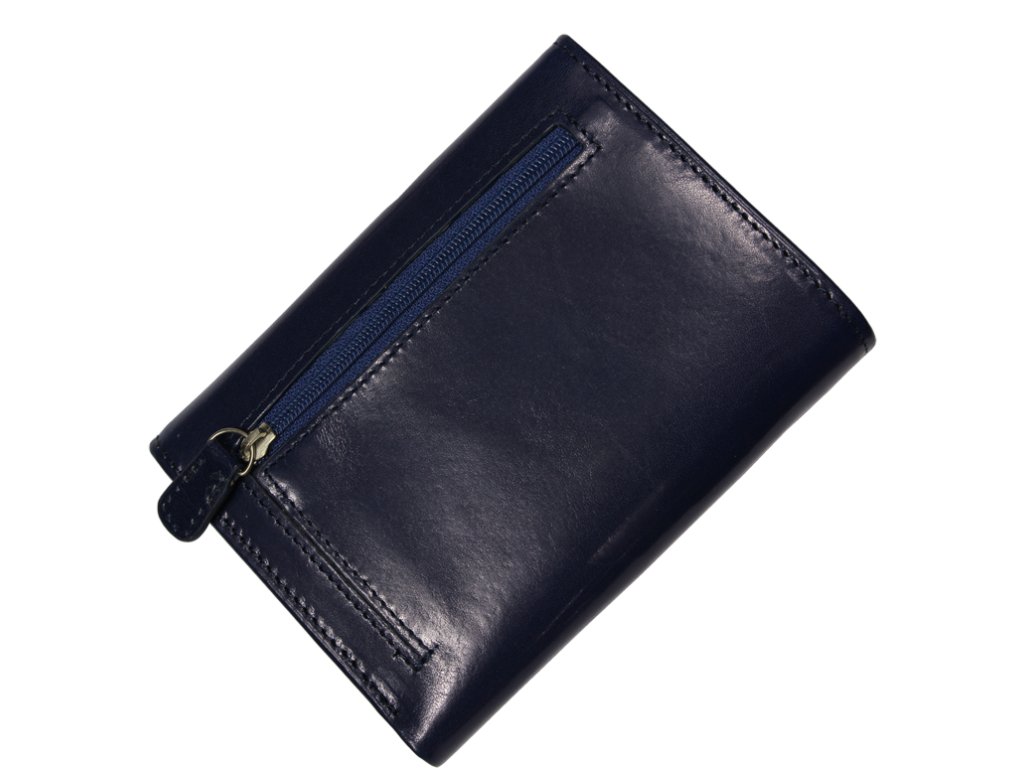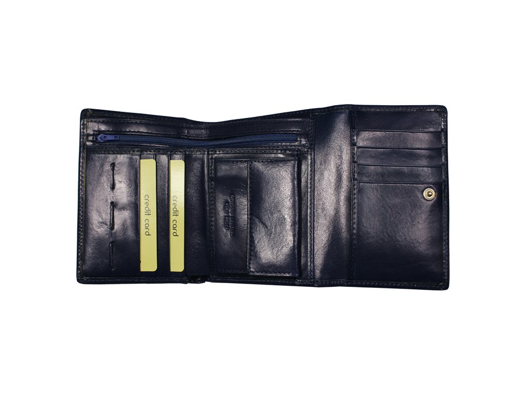 Elegantní dámská peněženka klasického designu v modré barvě. Tato kožená peněženka mírně obdélníkového tvaru se zavírá na patentek (cvoček). Má spoustu praktických přihrádek: zavírací kapsu na mince, jež zavírá pomocí dalšího patentku; 4 kapsy formátu bankovek, z nich 1 se zavírá na zip; a celkem 10 míst na platební a jiné karty. Navíc disponuje ještě 1 vnější kapsou na zip vhodnou na mince – při drobné útratě, tak není nutné otvírat celou peněženku.